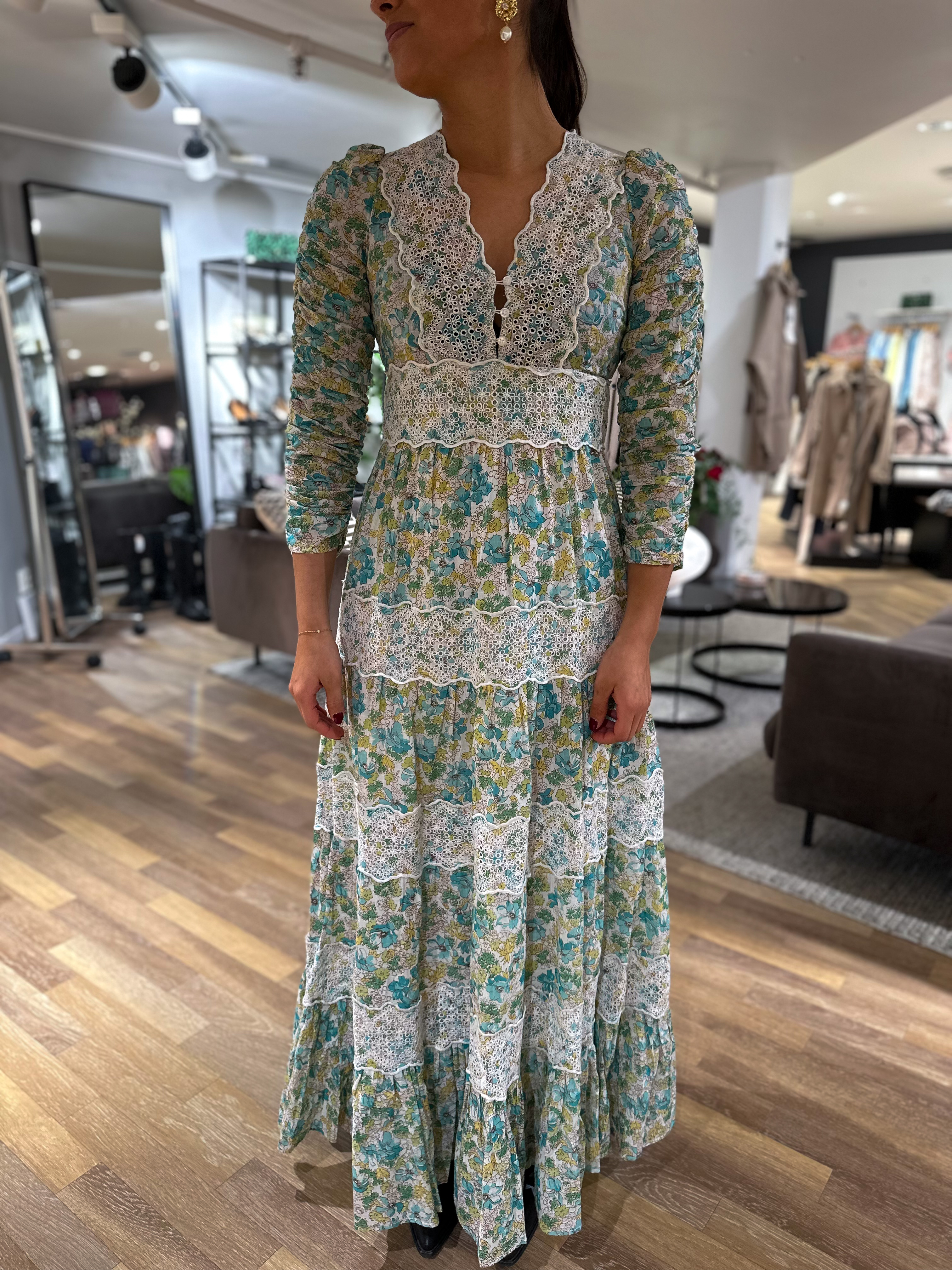"Cotton Slub Maxi Dress" fra byTimo. Super fin maxi kjole med flere kapper på skjørtet, kjolen har v-hals og vakker brodering på!