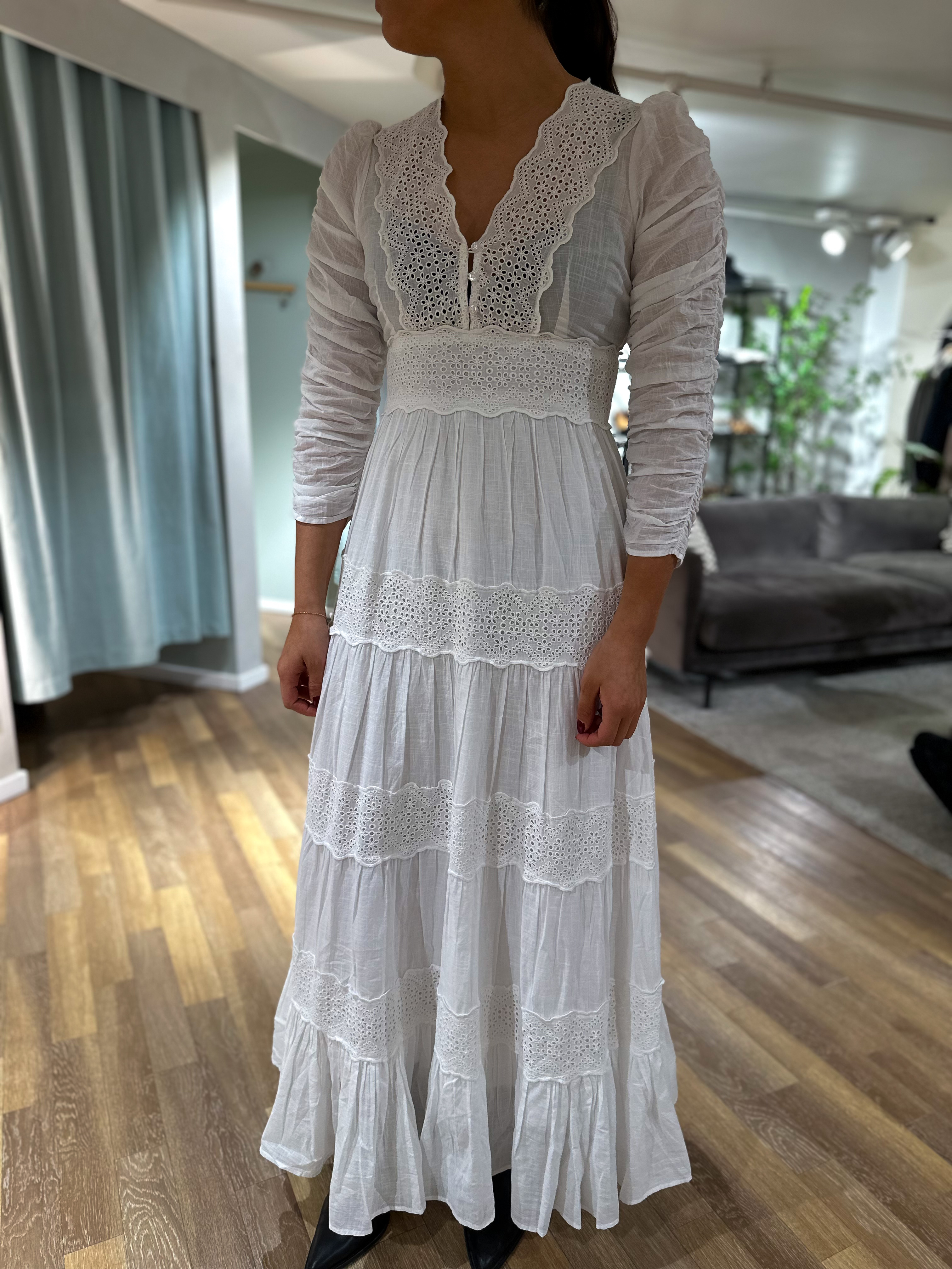 "Cotton Slub Maxi Dress" fra byTimo. Super fin maxi kjole med flere kapper på skjørtet, kjolen har v-hals og vakker brodering på!