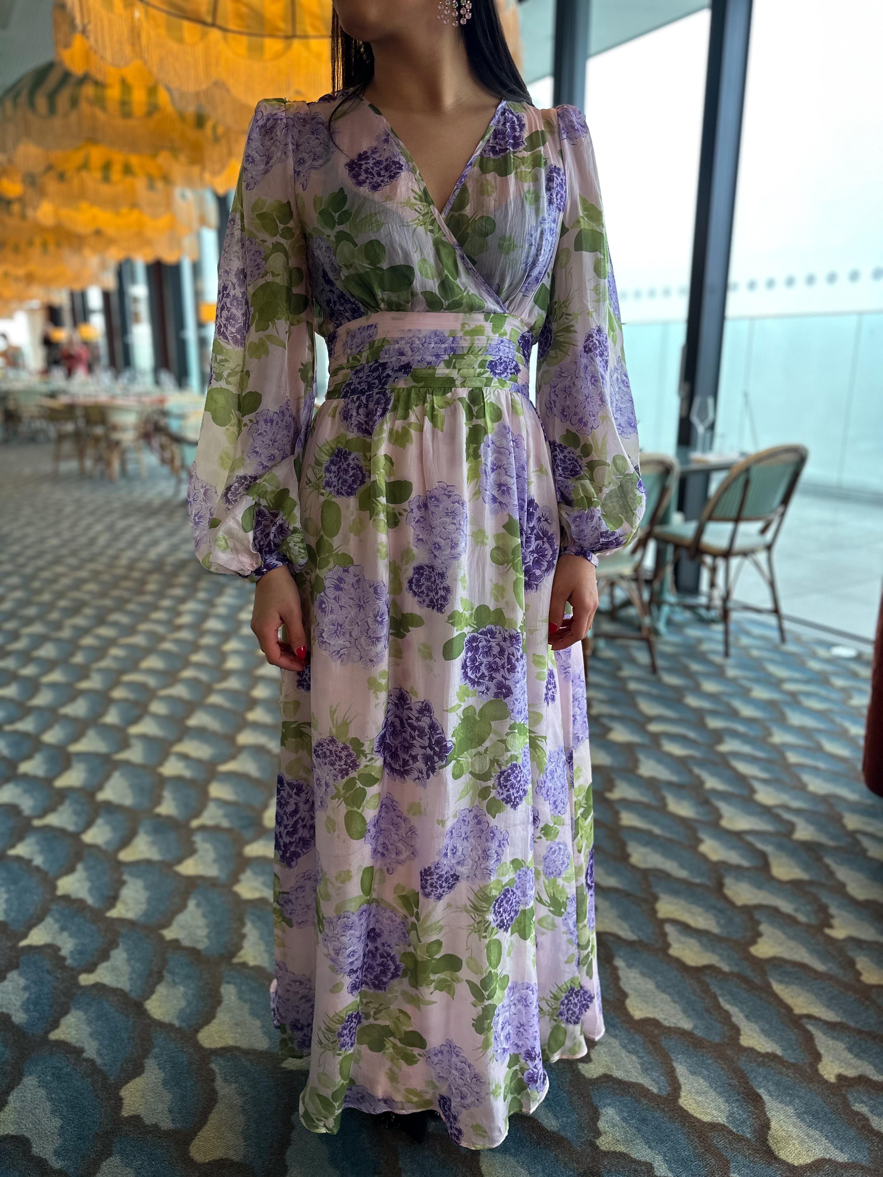 "Cupro Rouching Gown" fra byTiMo. Cupro Rouching Dress er kuttet i byTiMos glatte, silkeaktige cupro. Kjolen har et elegant maxiskjørt, figursydd topp med V-hals med rynkede detaljer og puffede ermer med elastiske mansjetter. Midjen er definert med et plissert panel.