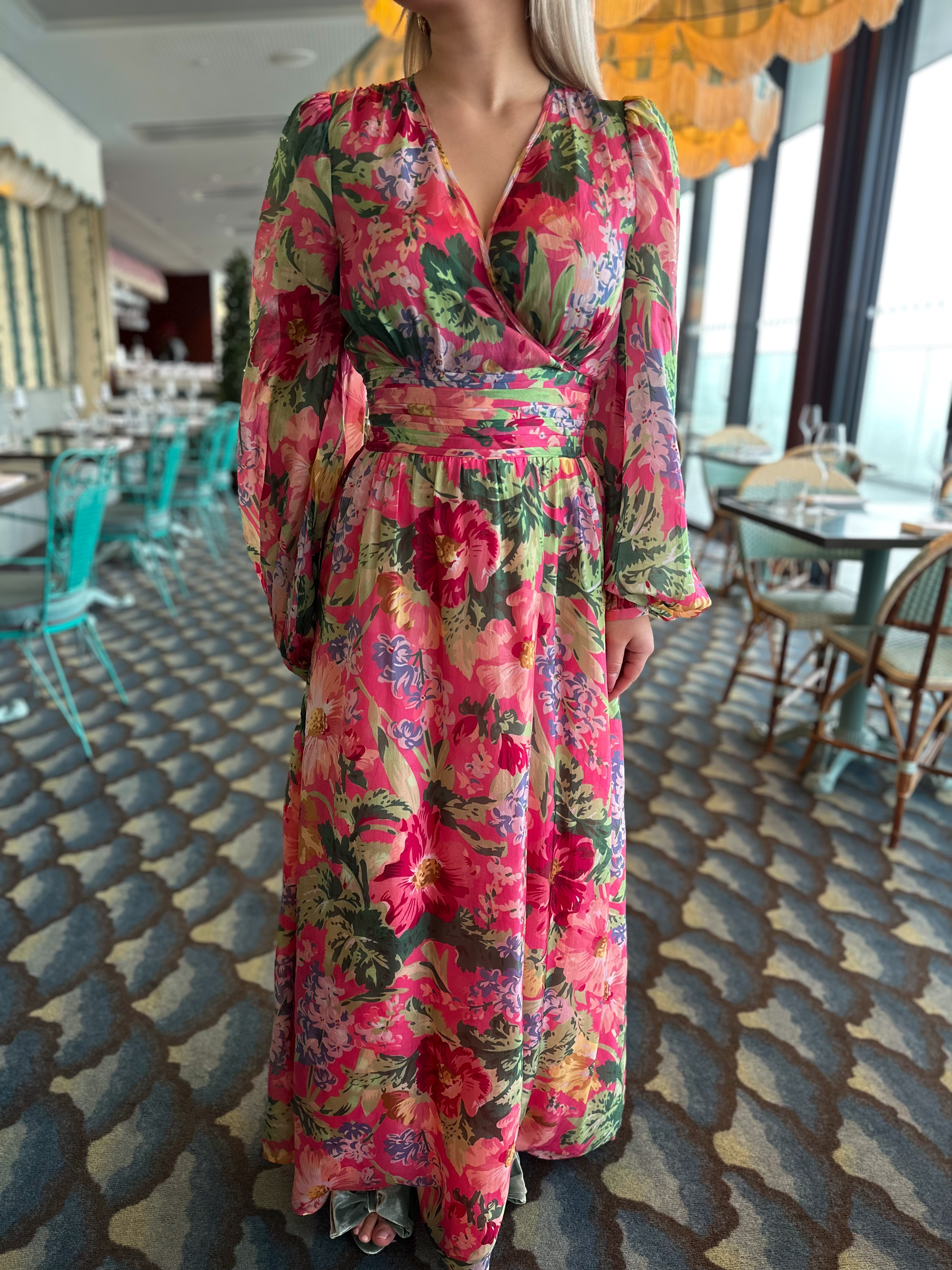 "Cupro Rouching Gown" fra byTiMo. Cupro Rouching Dress er kuttet i byTiMos glatte, silkeaktige cupro. Kjolen har et elegant maxiskjørt, figursydd topp med V-hals med rynkede detaljer og puffede ermer med elastiske mansjetter. Midjen er definert med et plissert panel.