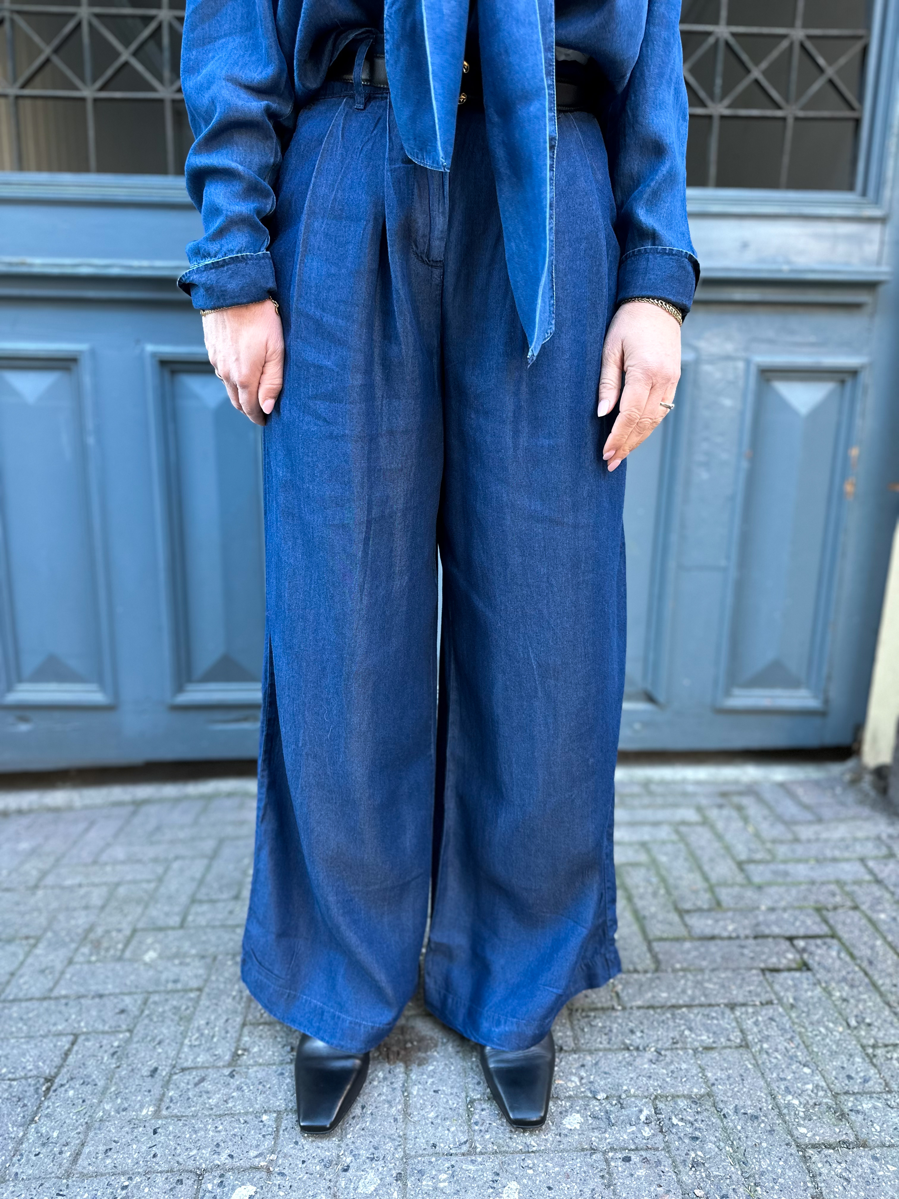 Janna Pleated Chambray Pant - er en bukse med høyt liv og vide ben.
