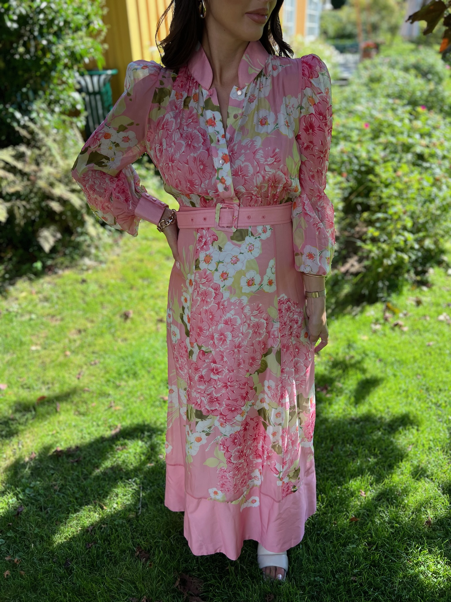 "Organza Maxi Dress" fra byTiMo. Organza Maxi Dress er laget i litt gjennomsiktige, FSC-sertifiserte viskosekvalitet. Denne maxikjolen har en innsvinget midje, mandarinkrage med knapper på toppen og lange puffermer med stramme mansjetter. Kjolen har beltehemper i midjen og leveres med et løst, matchende belte.