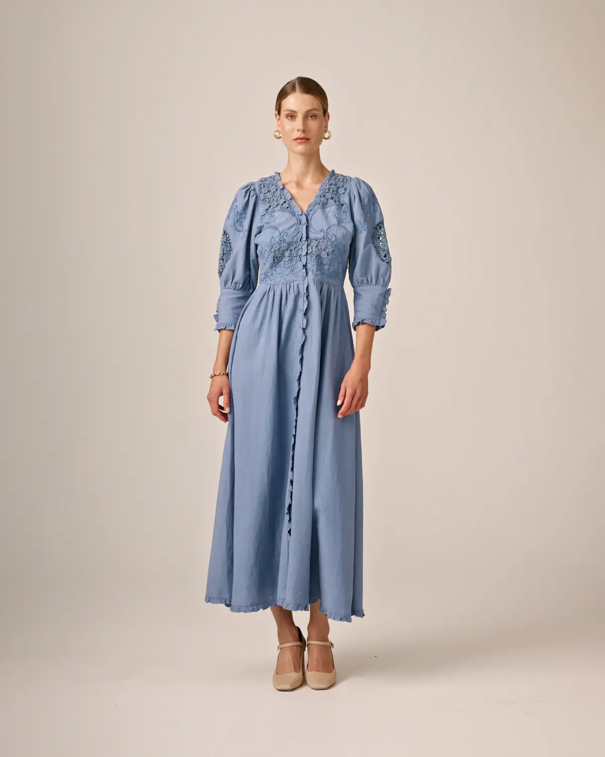 "Linen Button Down Dress" er kuttet i byTiMo sin elegante og fine kvalitet av sertifisert lin og viskose. Kjolen har midi-lengde, figursydd topp og flytende skjørt. Den har V-hals med korte, puffede ermer og stramme mansjetter. Den har knapper foran og mange broderidetaljer.