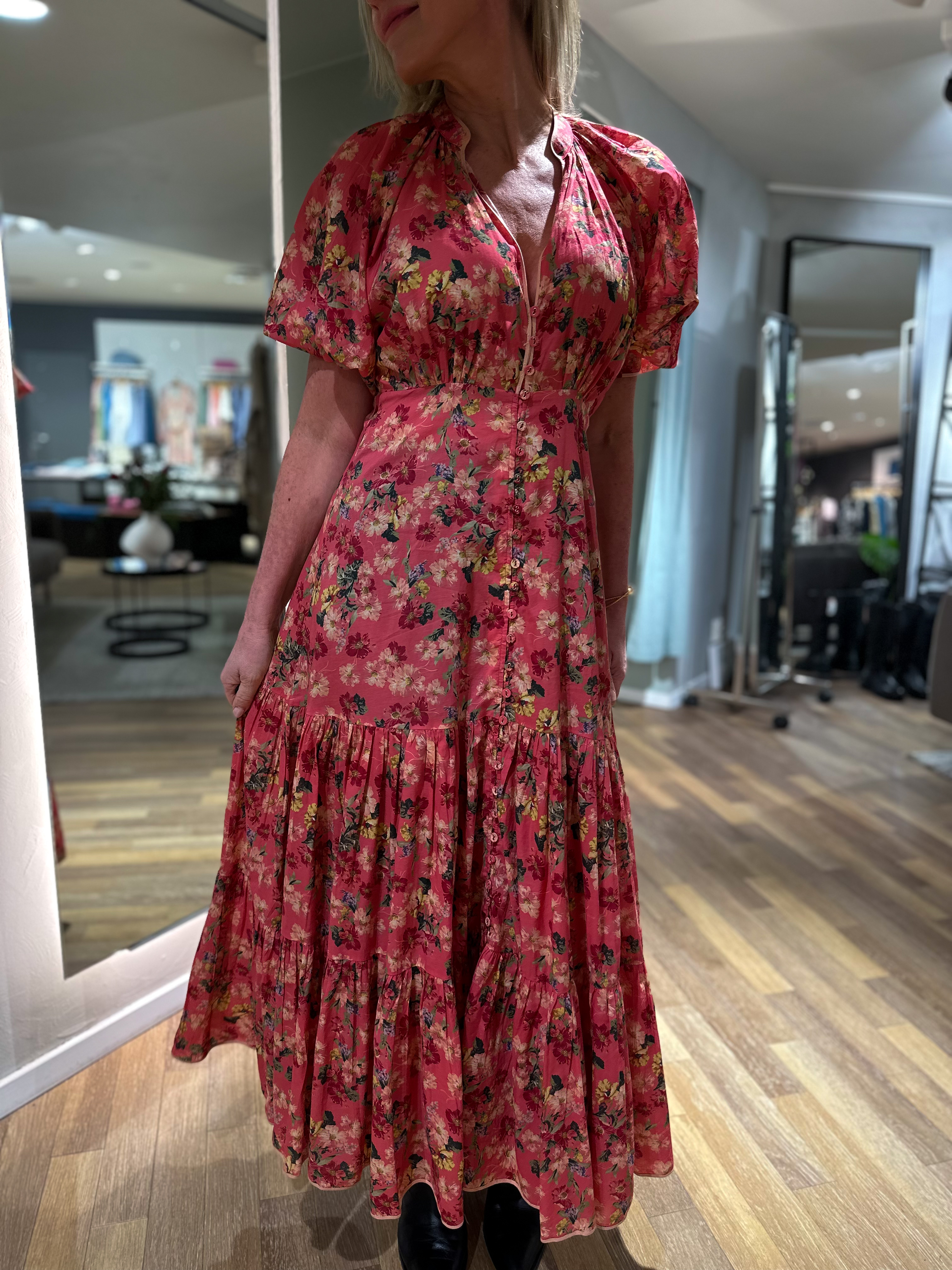 "Cotton Party Maxi Dress" er kuttet u byTiMo sin veldig myke og pustende BCI-sertifiserte bomull. Kjolen har maxi-lengde, justert topp og flytende silhuett fra under brystet, mandarinkrage med V-hals og korte puffede ermer med stramme mansjetter. Kjolen har knapper foran med splitt i enden.