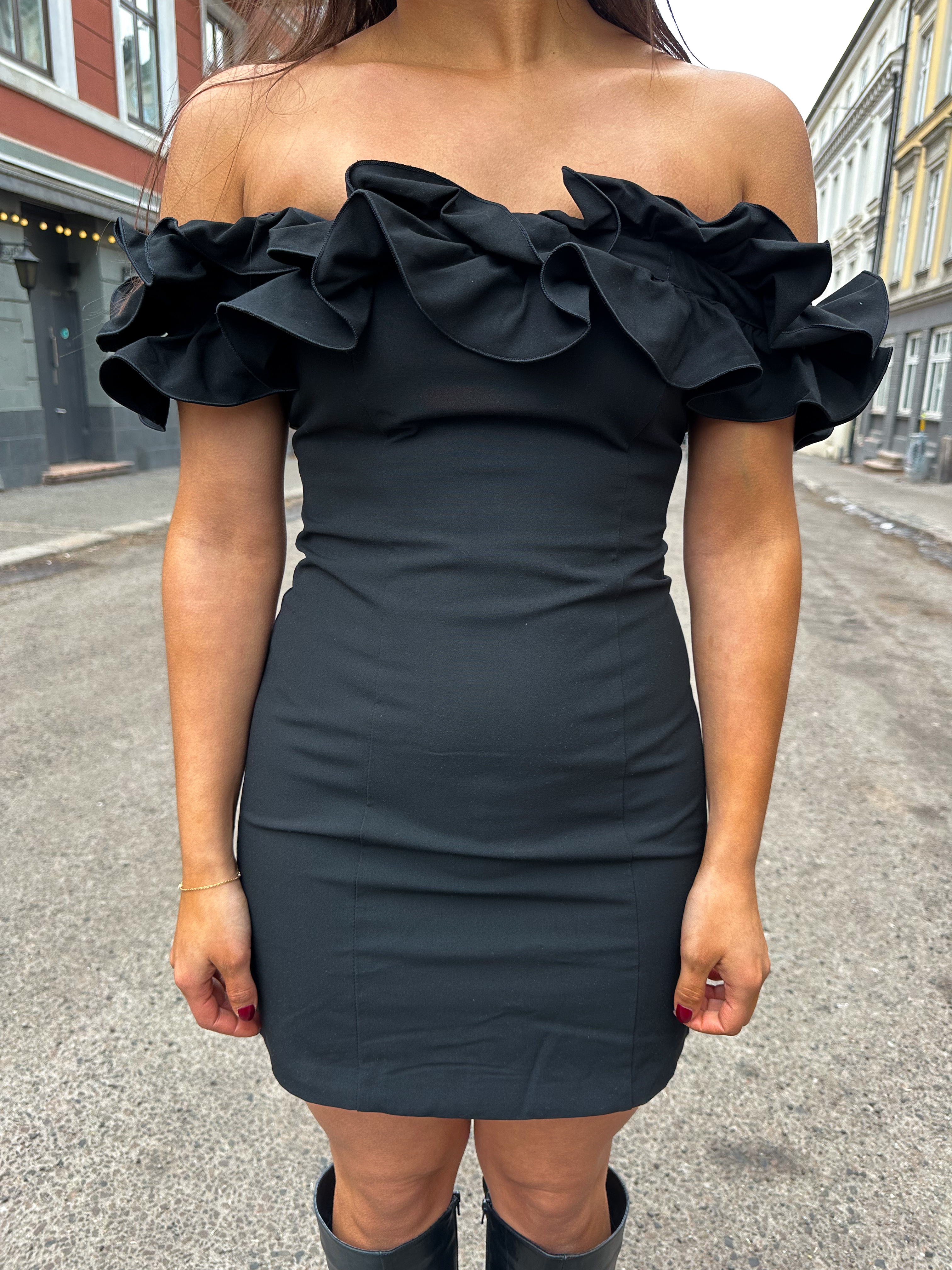 Mini Ruffle Dress fra ROTATE. Super kul minikjole fra ROTATE - en edgy variant av den lille sorte! Mini Ruffle Dress har off shoulder-utringning med volanger som er et umiddelbart blikkfang. Kjolen har en figurnær passform med behagelig stretch og kort lengde.