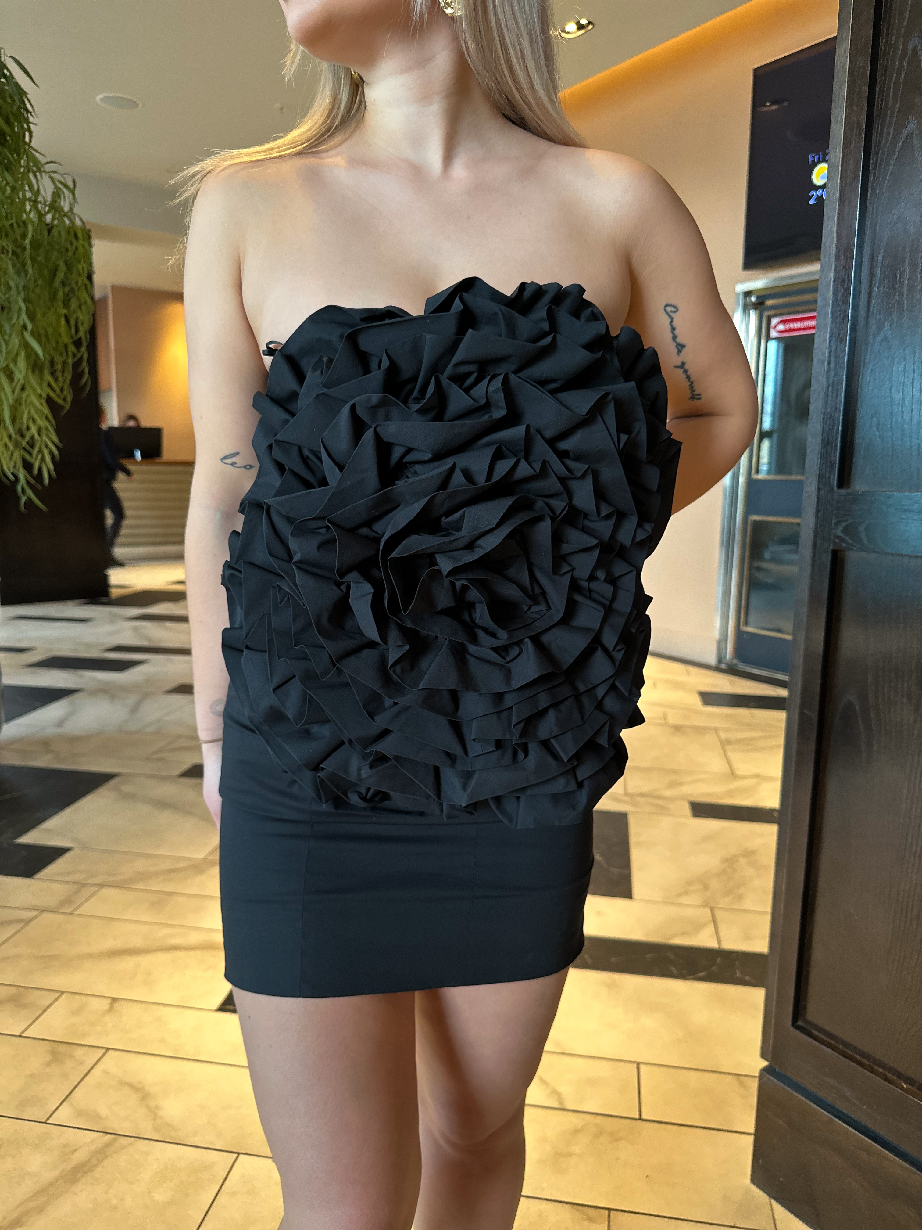 "Big Flower Mini Dress" fra Rotate. Kjolen har en mini-lengde, silikonbånd for ekstra komfort og sikkerhet, og en side-slukning for perfekt passform. Den store blomsterdetaljen på fronten gir kjolen et unikt, stilfullt preg.