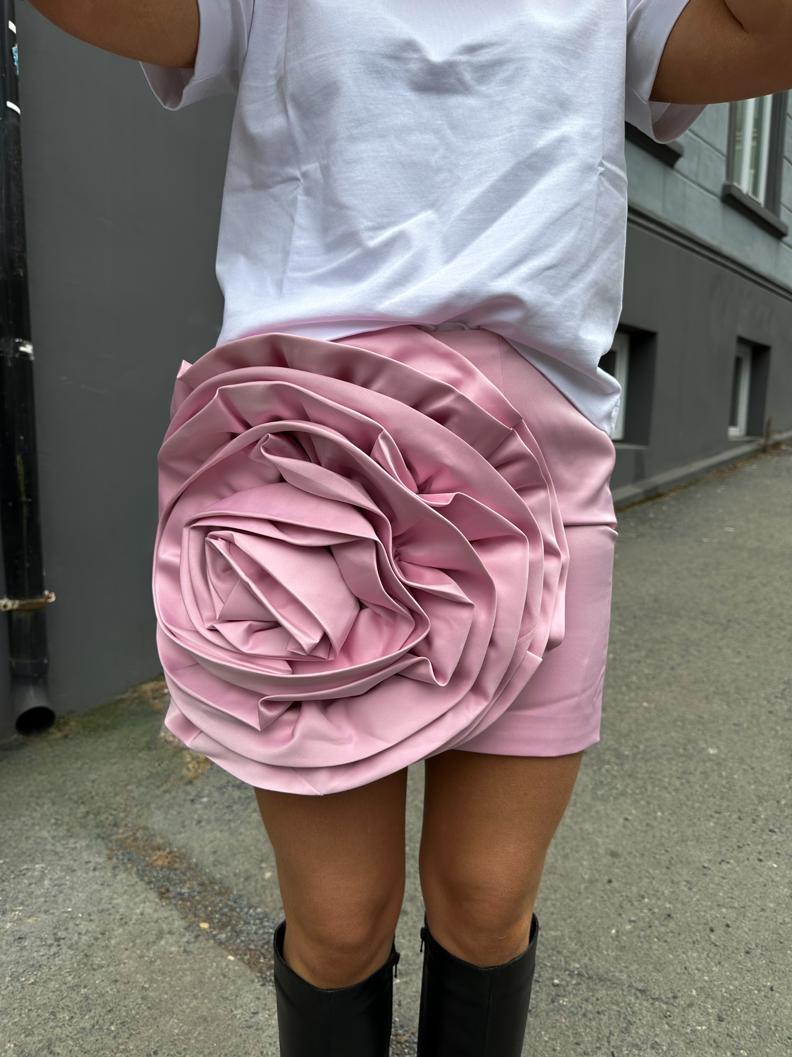 «Satin Big Flower Skirt» fra Rotate. Super kult skjørt med en stor blomst forran. Skjørtet er tettsittende.