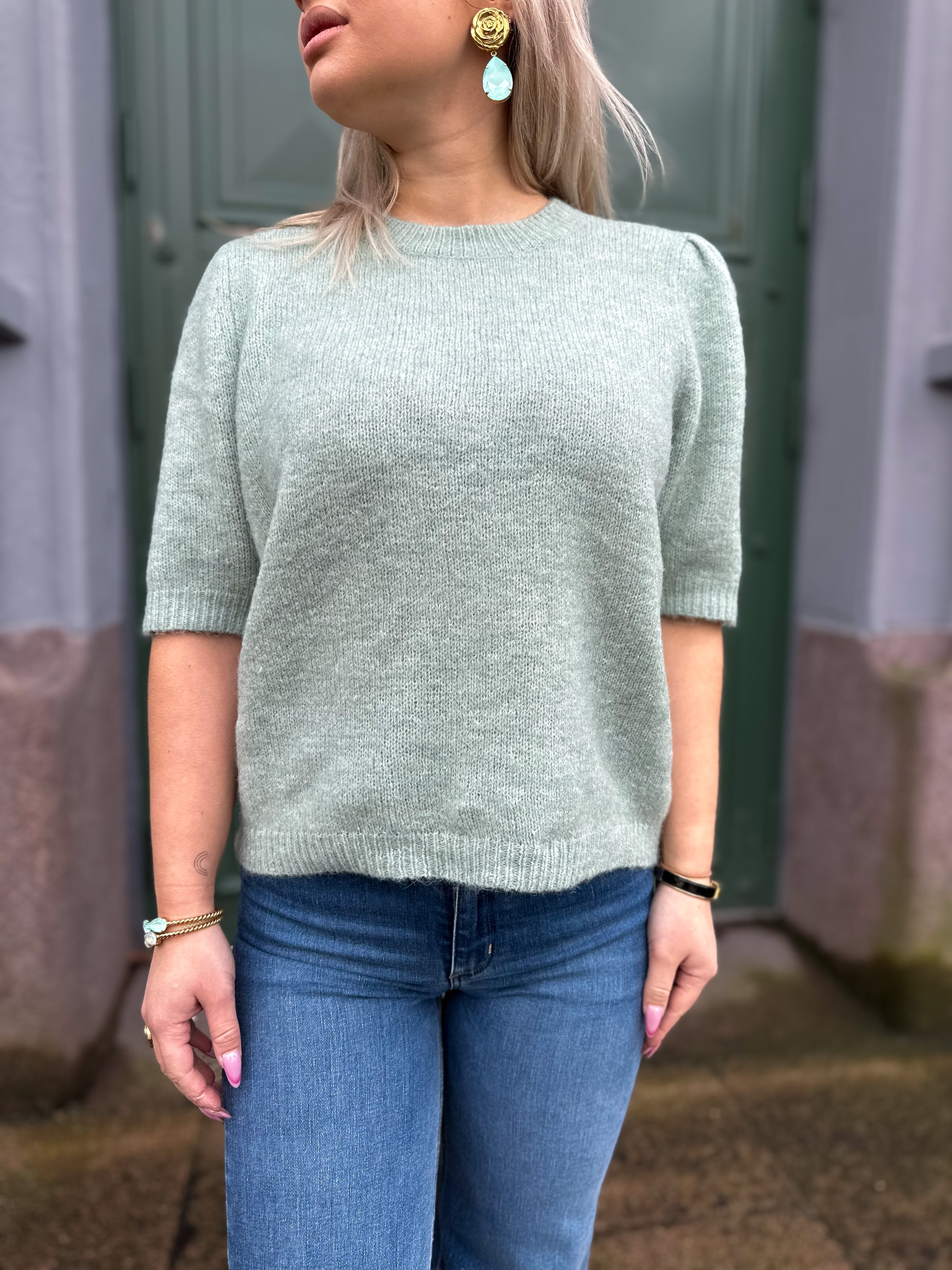 "Anne Knit Pullover" fra Yas. Delikat kortermet ullstrikk i lysegrå farge med pufferm og rund hals. Disse toppene er fine og matche til sesongens tyllskjørt. Toppen er rett i modellen og normal på str.