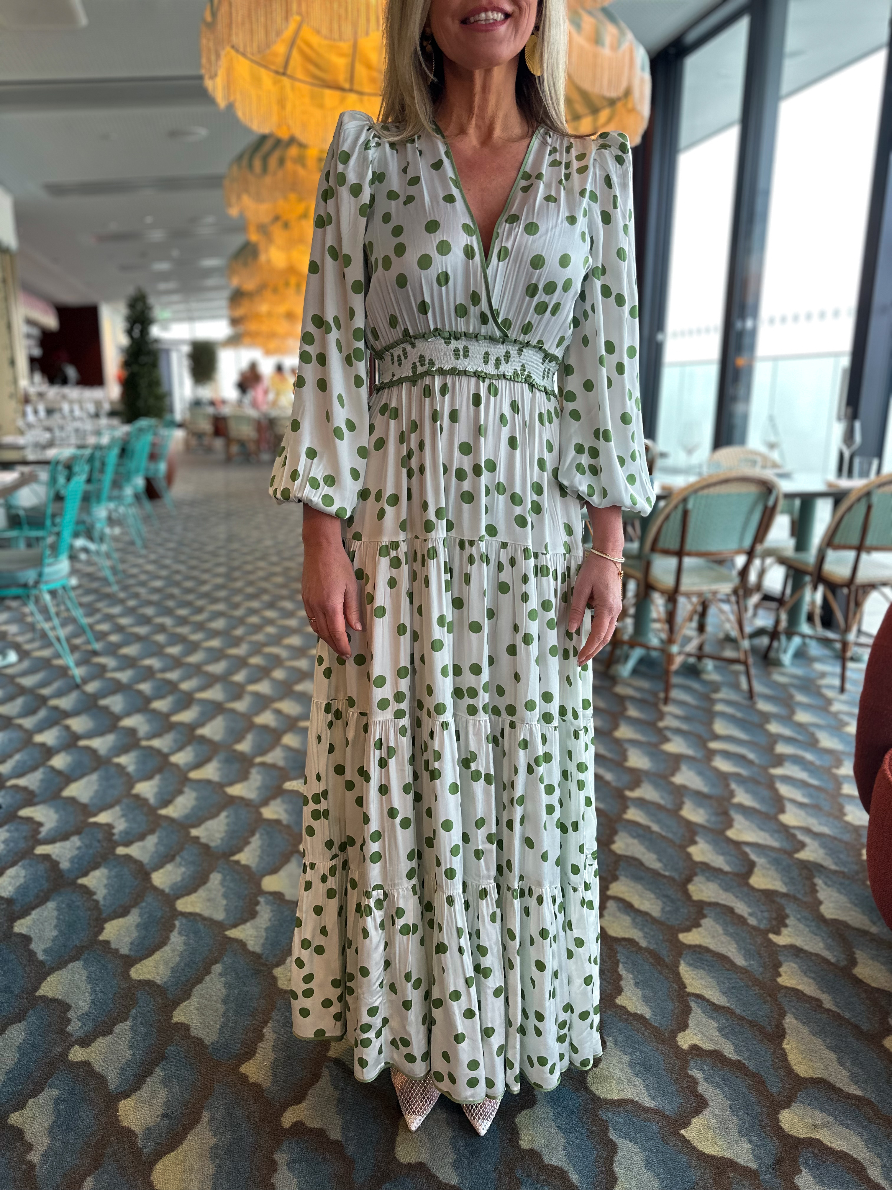 "Satin Maxi Dress" fra byTiMo. Kjolen har et luksuriøst preg med tungt skinnende silkelignende stoff. Den har maxi-lengde, tilpasset midje laget av elastisk smock, flytende skjørt, dyp V-hals og lange ermer med elastiske mansjetter. Kjolen lukkes i siden med glidelås.