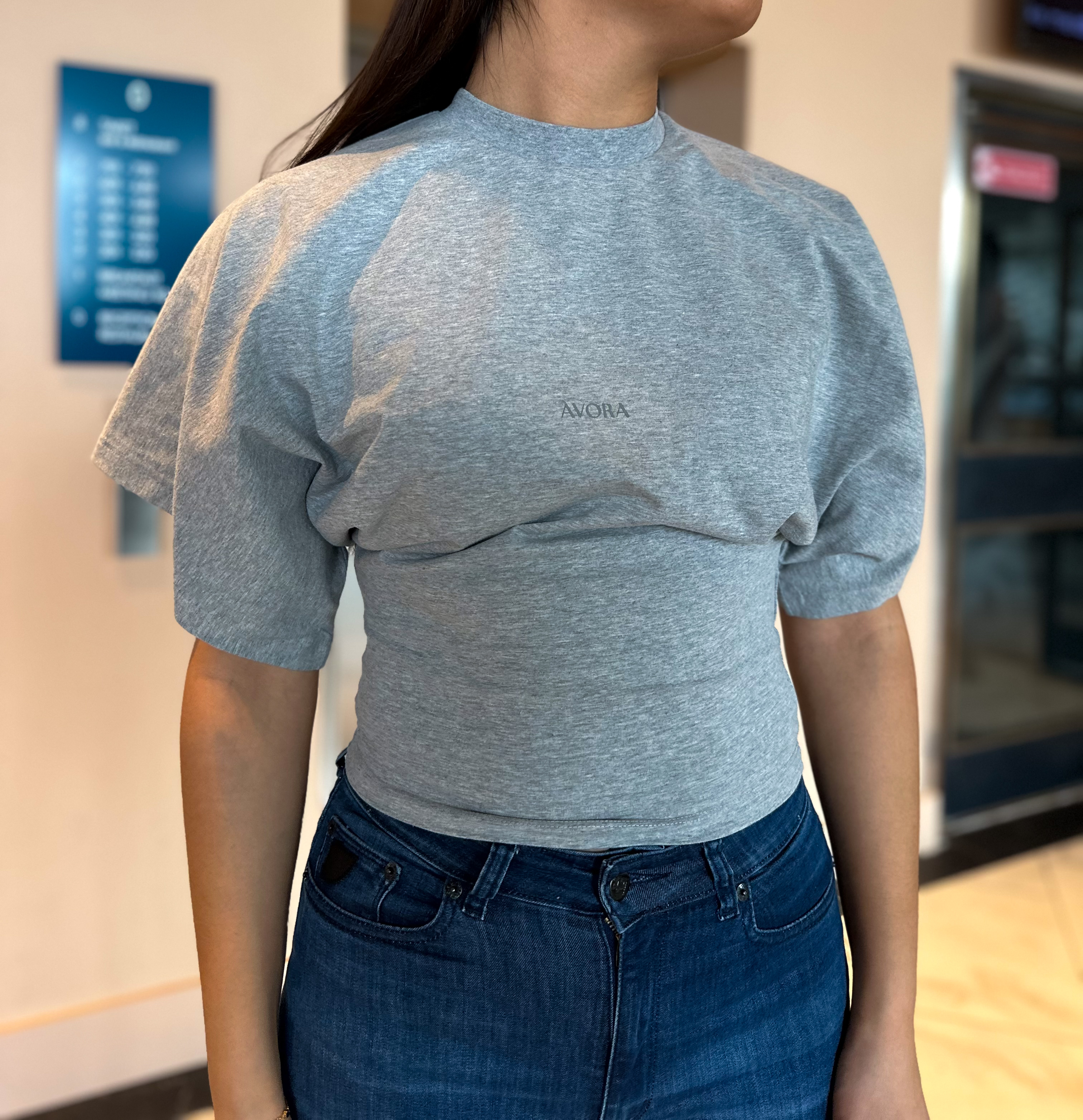 Dna Tee fra Avora. DNA Tee fra ÀVORA er ikke bare en vanlig t-skjorte, den er en ekte klassiker med en subtil logo på brystet. Den høye og runde halslinjen gir en sofistikert touch, mens den innsnevrede midjen gir en formet passform. De brede ermene gir en avslappet, men edgy look som passer perfekt til enhver anledning. Du kan enkelt style denne t-skjorten med et par high-waisted jeans og chunky sneakers for en urban og trendy look, eller med et skjørt og noen kule boots for en mer feminin stil.