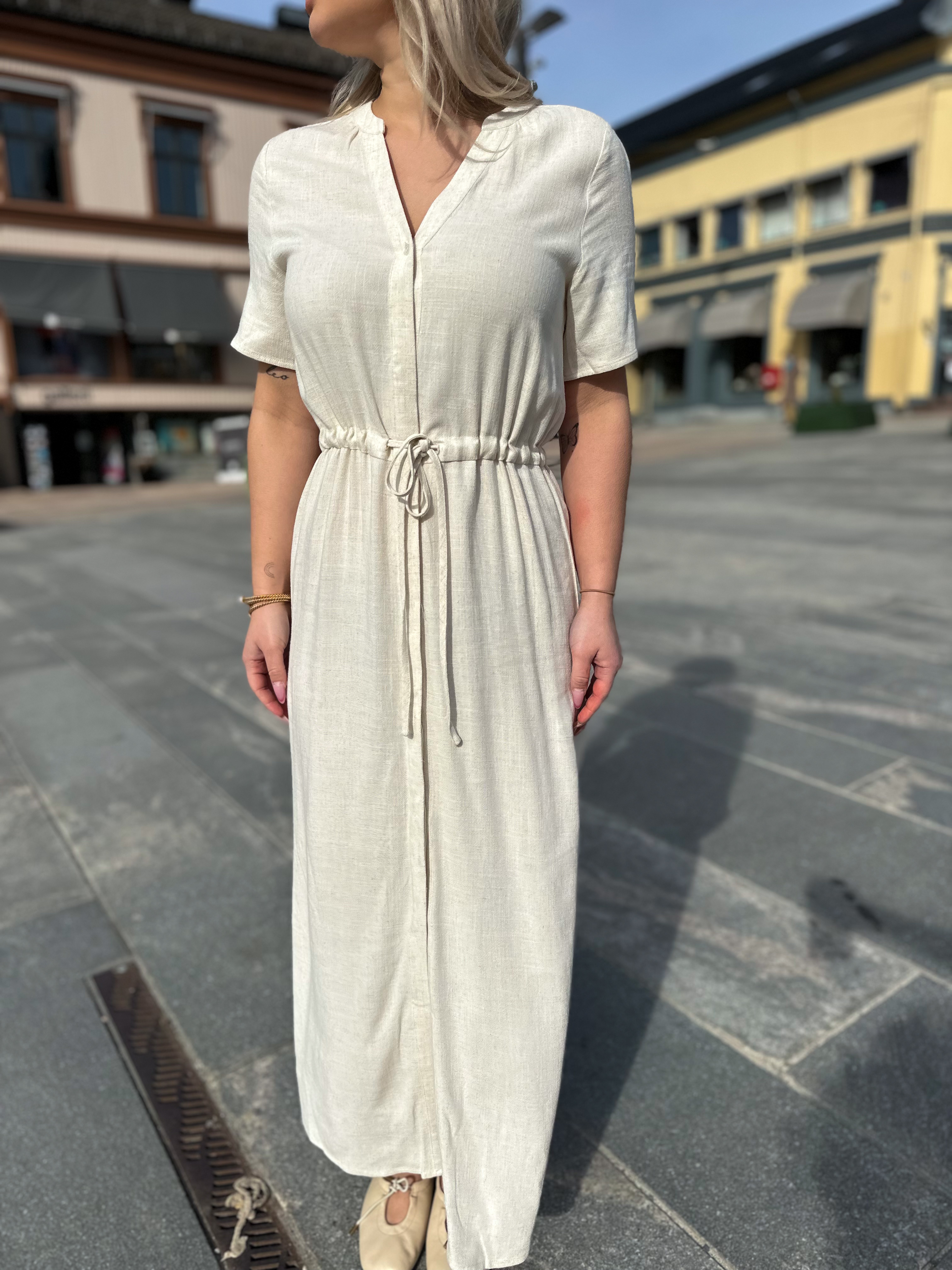 «Viva-Damina Ankle Sun Dress» fra Selected Femme er en kjole perfekt for sommerdager. Kjolen har en O-hals, korte ermer og knappelukking. Den er ankellang og har en justerbar midje med belte.