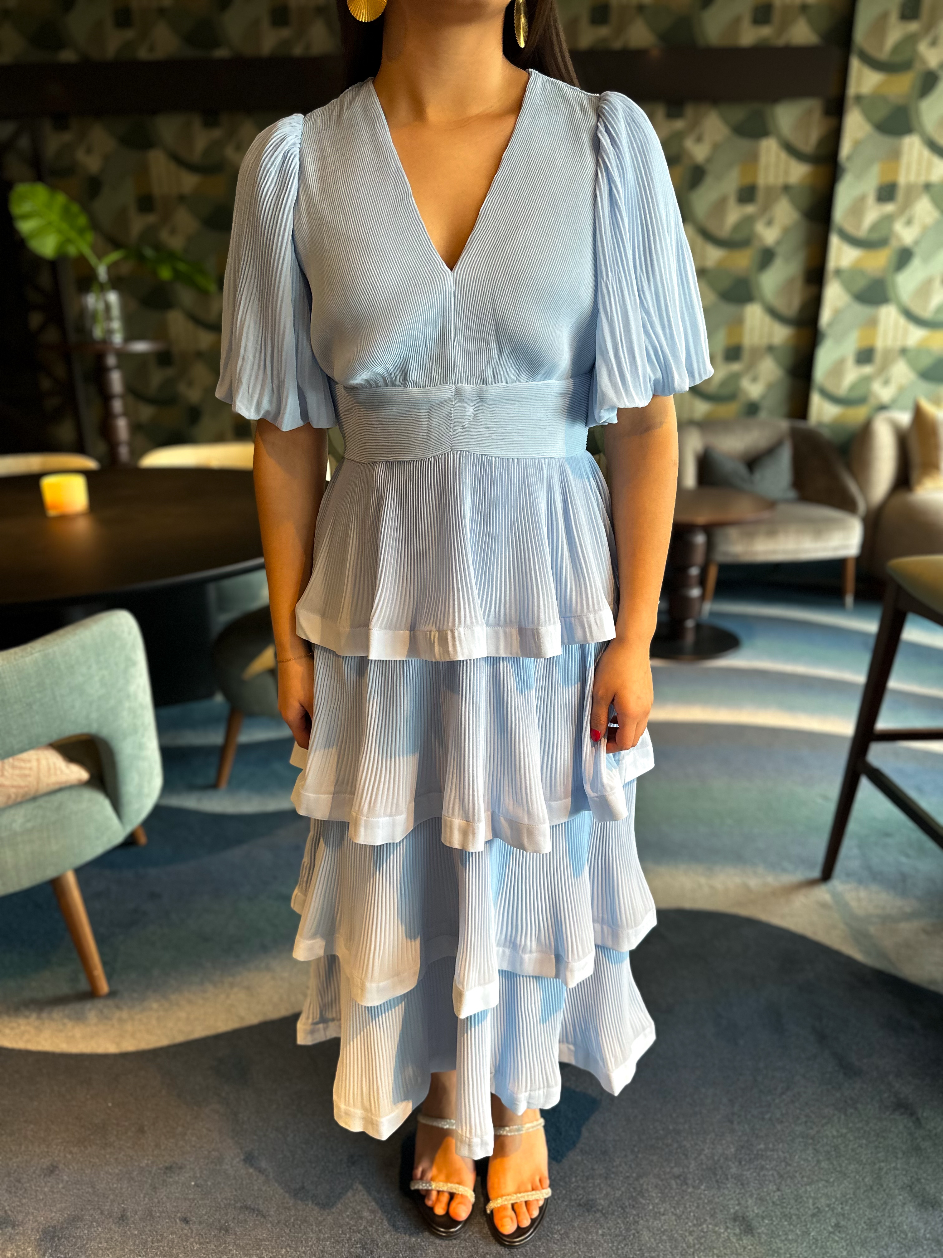 "Plira Long Dress - Show" - Denne kjolen har flere lag, som faller superfint på kroppen, V-utringning og luftige ermer. Den er super pen og virkelig sommerlig - gjør deg klar til fest!