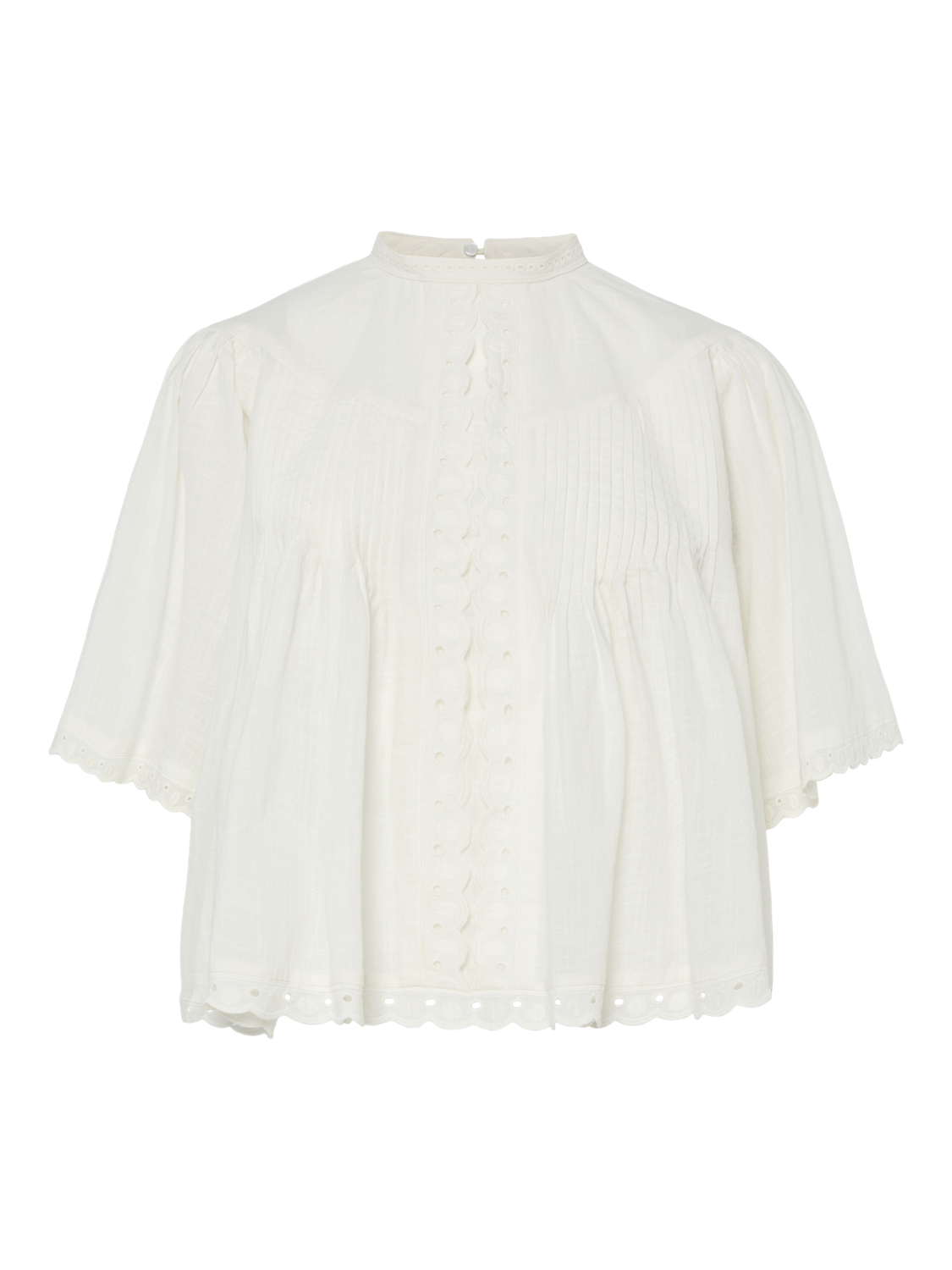 "Liru 2/4 Top " fra Yas. Super lekker topp med kort erm. Toppen har broderte detajler langs brystet og på kantene. Toppen har en løs passform.