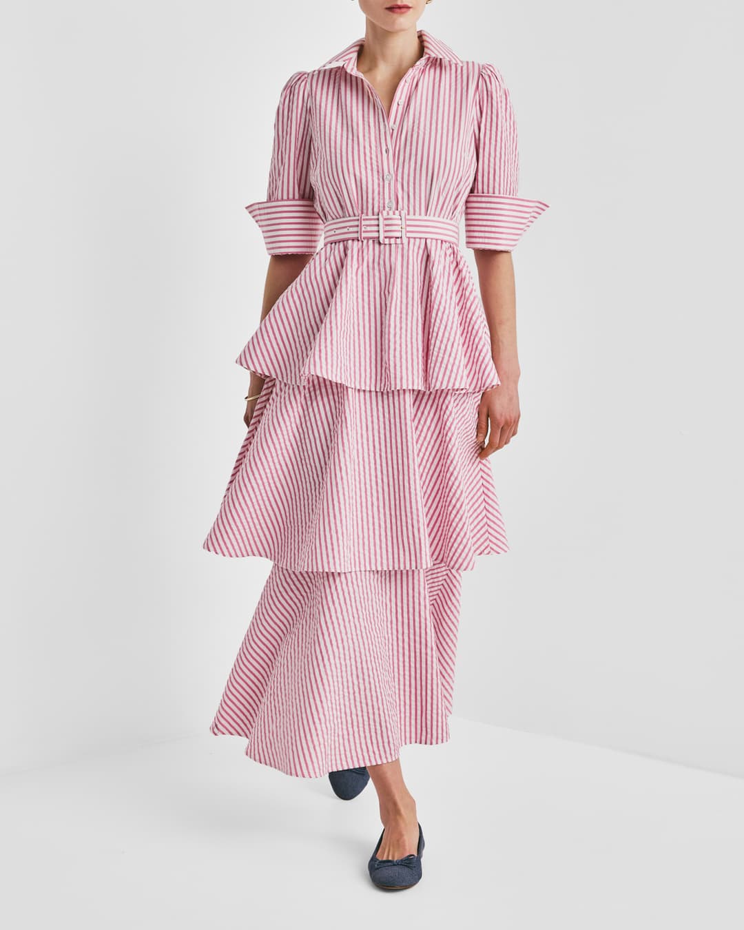"Seersucker Flounce Dress" fra byTiMo. Nydelig kjole fra byTiMo med kapper ned langs skjørtet, korte ermer og krage. Kjolen har ett avtagbart belte i midjen.