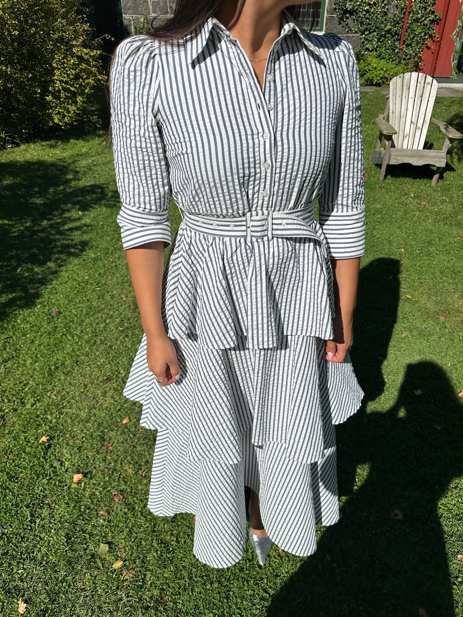 Nydelig kjole fra byTiMo med kapper ned langs skjørtet, korte ermer og krage. Kjolen har ett avtagbart belte i midjen.