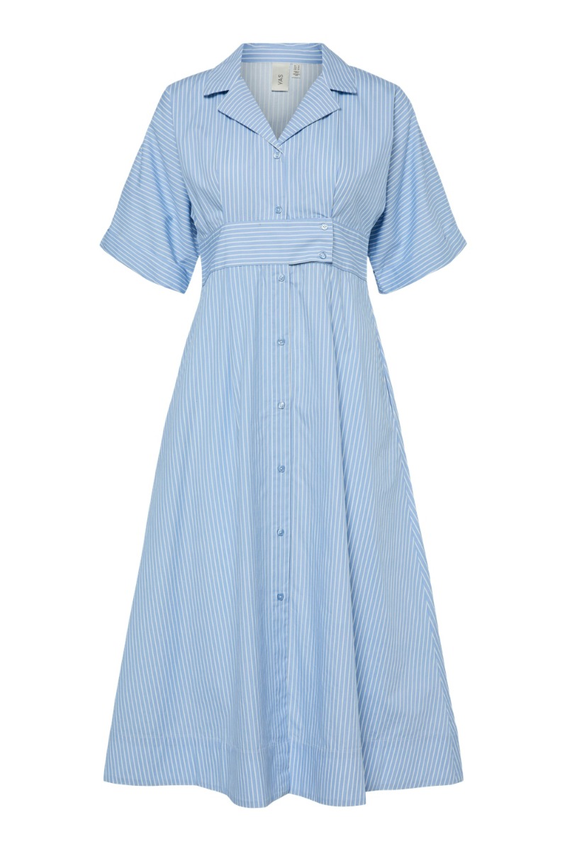 "Astor 2/4 Midi Dress - Clear Sky/Stripes" - Super søt kjole fra YAS . Kjolen har den fineste blånyansen, v-hals og krage. Den har en elegant lengde og kan enkelt brukes både til hverdags og spesielle anledninger.