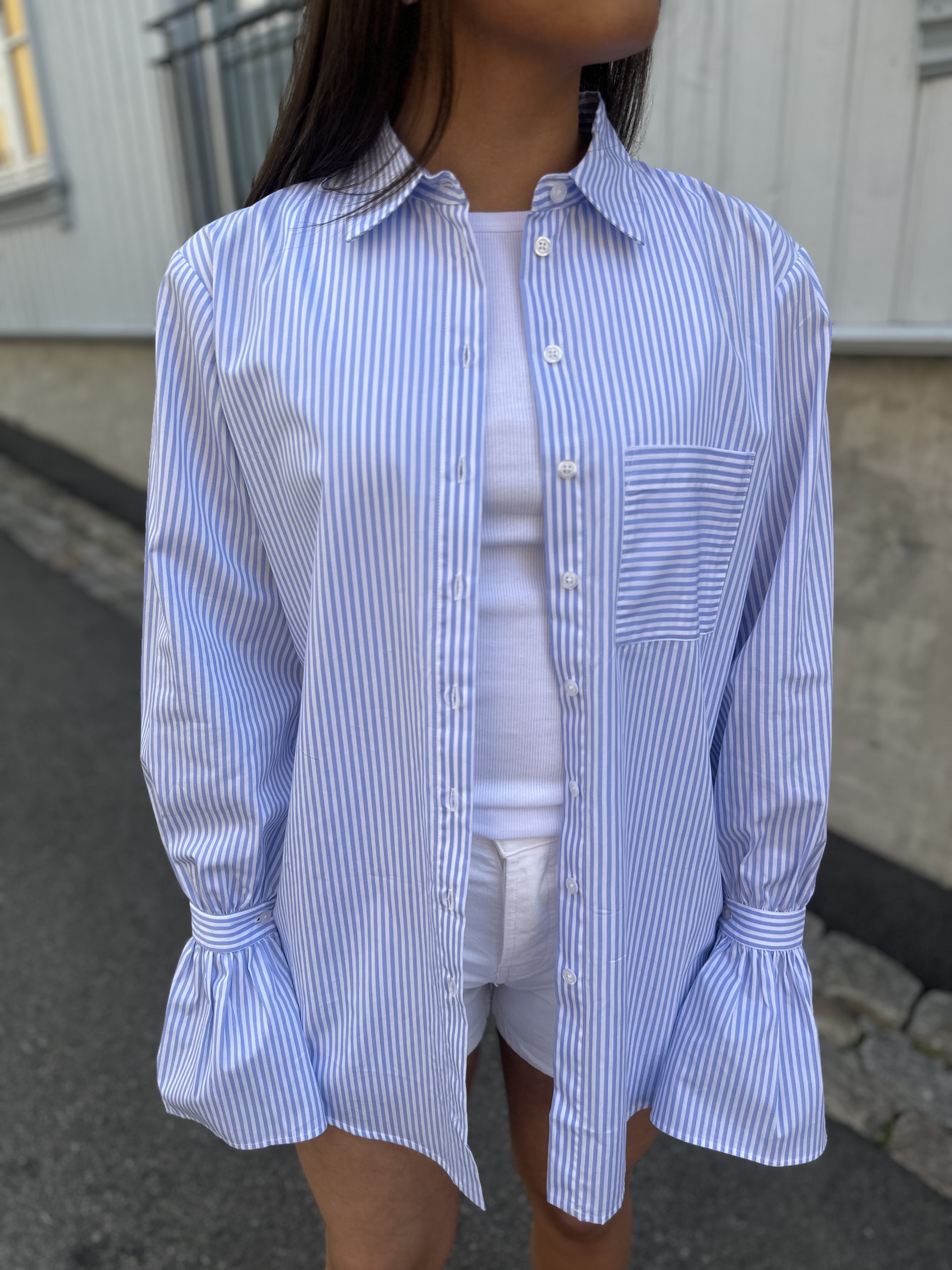 " Jules Shirt" fra MANDIBREEZE . Jules Shirt i blå og hvite stripe er en tidløs klassiker med en leken vri. Laget av 100 % økologisk bomull, kombinerer denne skjorten et klassisk design med detaljer som gir den et unikt preg, som de flagrende ermene. Den har en oversize passform som gir en avslappet og komfortabel look, og knappelukking på ermene tilfører ekstra stil. Skjorten passer perfekt til både hverdagsbruk og mer formelle anledninger.