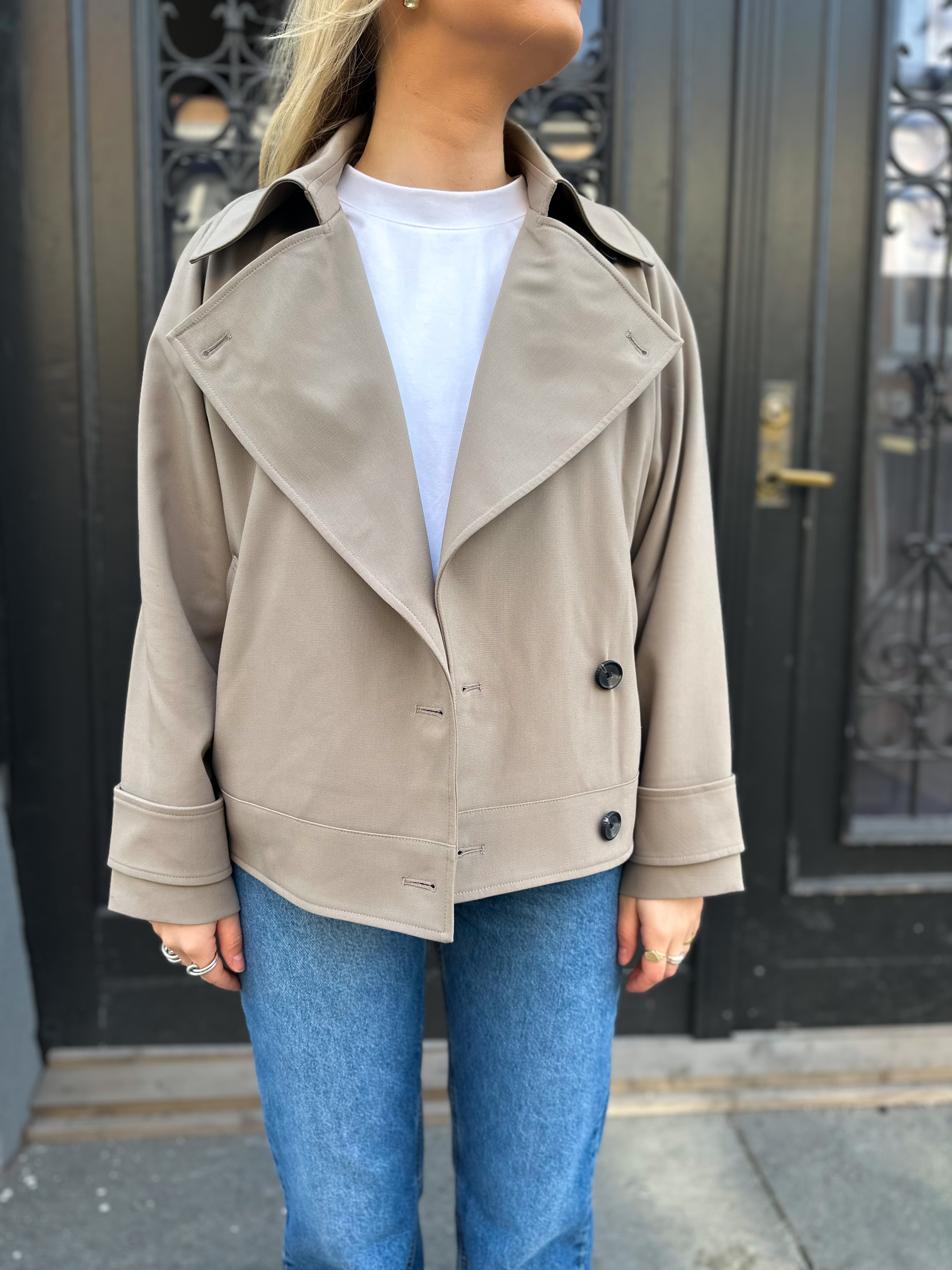 "Silvie Trench Jacket" fra Second Female. Trench jakke med asymmetrisk feste. Jakken er laget i en glatt og drapert viskoseblanding. Med bred krage og off-center knappelukking med knapp under kragen s Lange ermer med justerbare stropper med knapper ved mansjettene. To sidelommer. Delvis foret. Bred og avslappet passform.