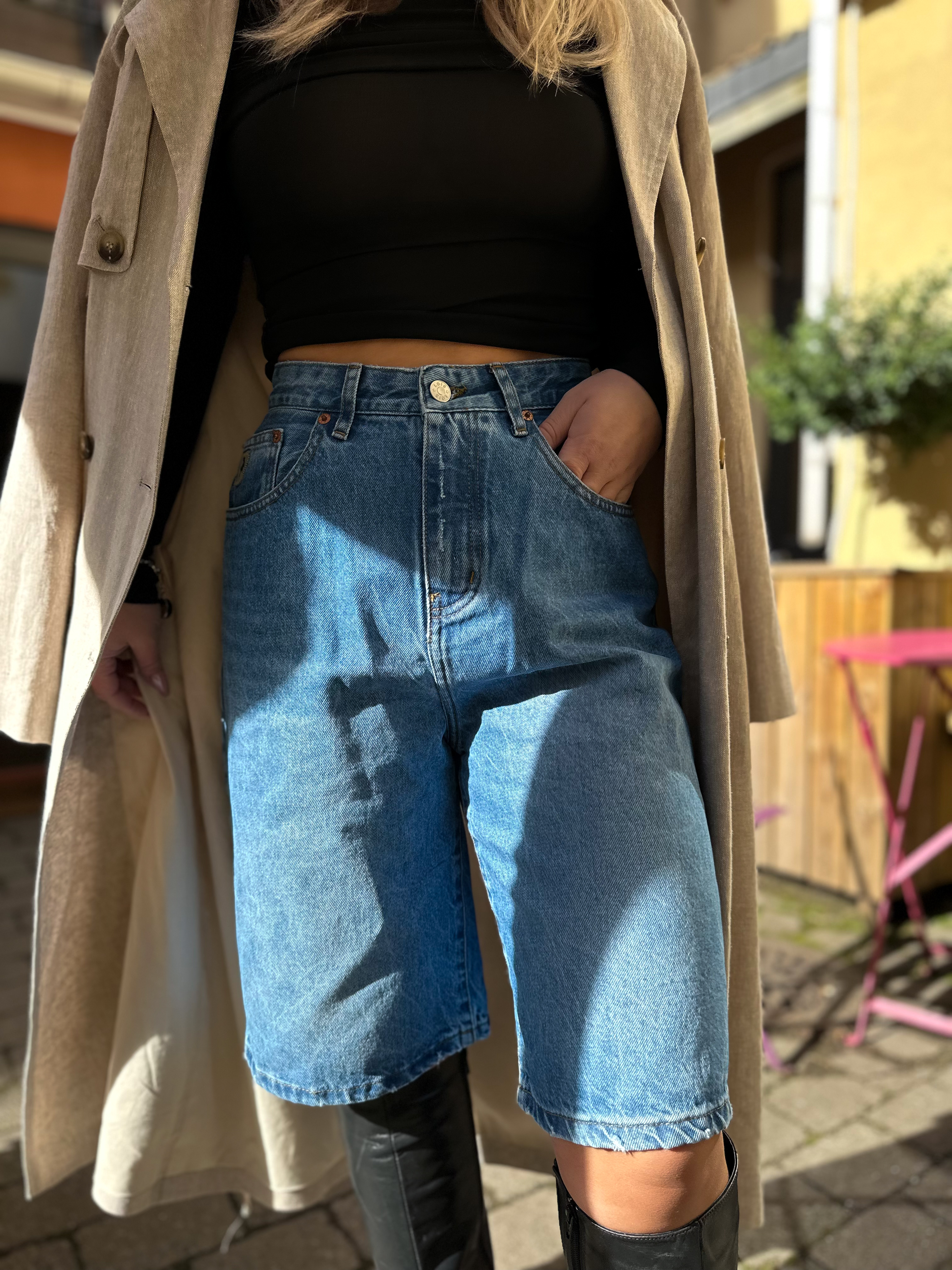 Camille Shorts fra LOIS er en moderne bermudashorts med en avslappet passform og autentisk denimfølelse. Med sin høye midje og rette, lengre ben gir den en flatterende silhuett og en tidløs look. Shortsen er laget i en stiv denim uten stretch, noe som gir en klassisk vintagefølelse og et robust uttrykk. Som en del av LOIS’ Bio Denim-kolleksjon er den også et mer bærekraftig valg.