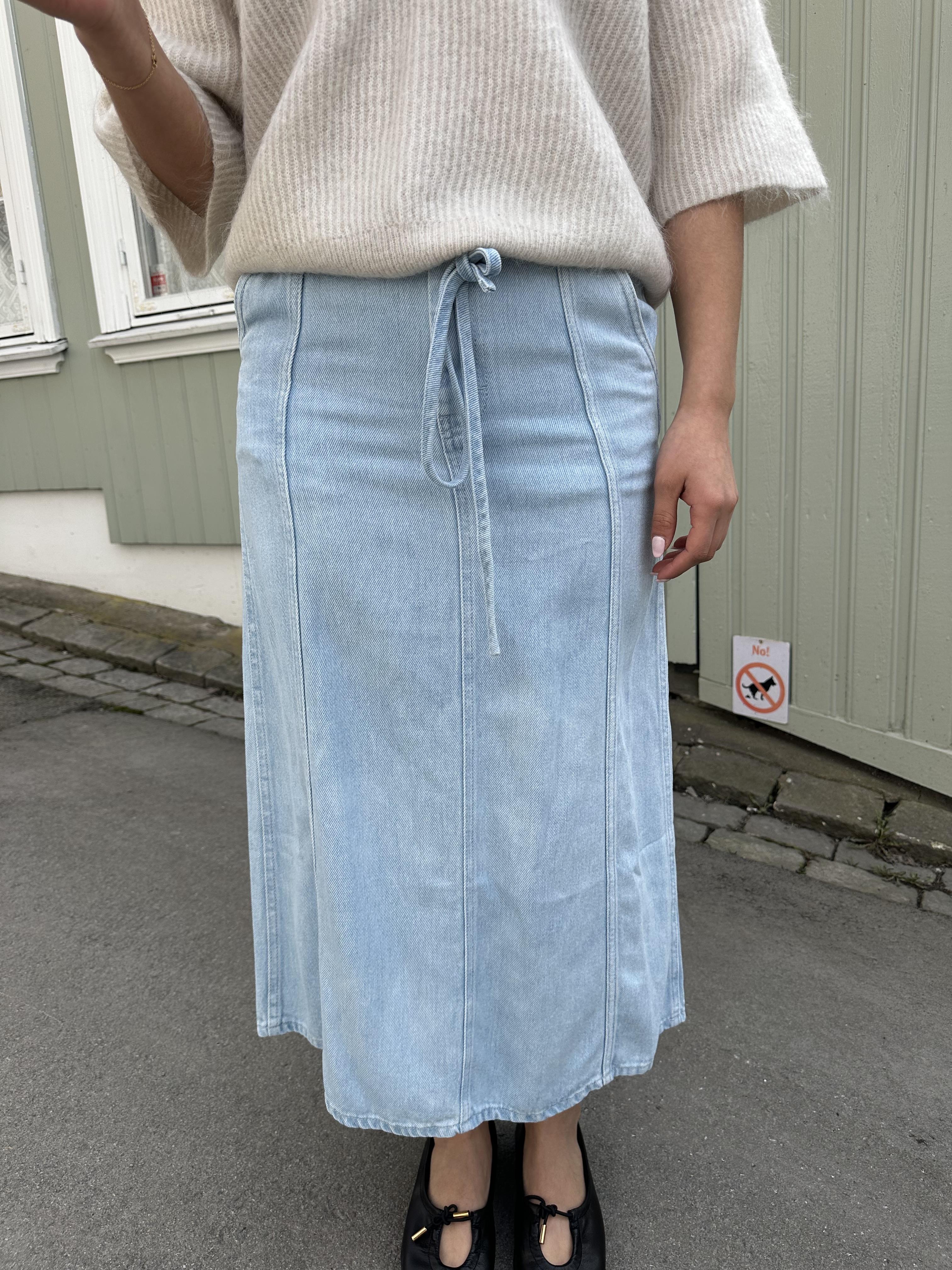 "Irvin Denim Skirt" - Skjørtet er laget i myk og draperende lyocell-denim med ton-i-ton sømmer. Det har en skjult glidelås, krok og knappfeste på innsiden av midjebåndet. Belte i stoff i midjen. To skrå lommer. Formet yoke bak. Innsydde sømmer bak. Slim fit med lett A-form.