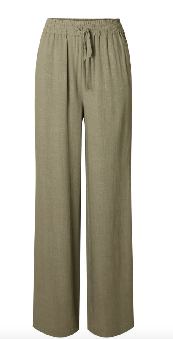 «Viva gulia long linen pant» fra Selected Femme. Herlig bukse i deilig lin og viskose kvalitet. Buksen har vie rette ben og har bred strikk i midjen med knyting.