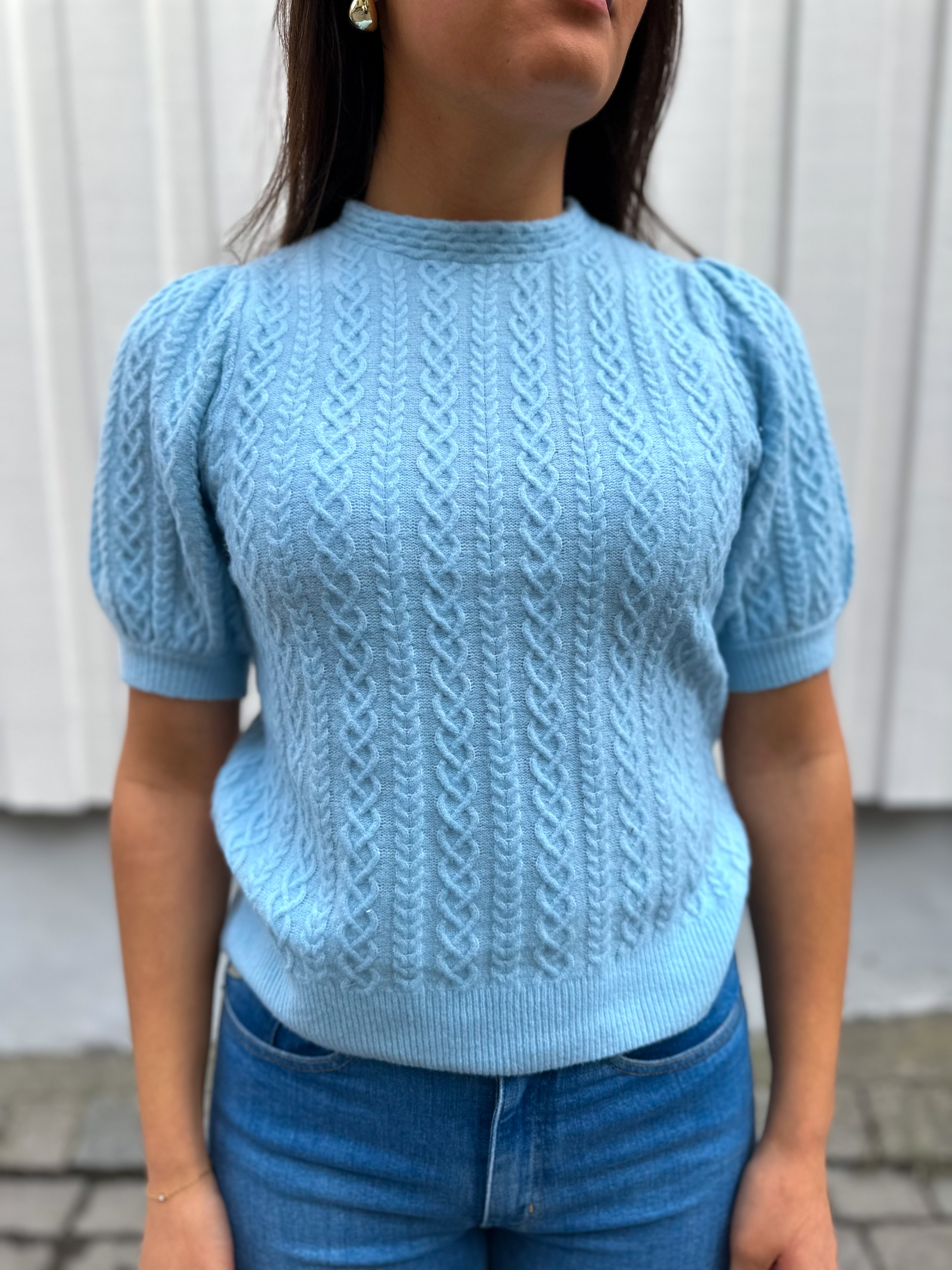 "Clara 2/4 Knit Pullover" fra YAS. Super lekker topp med flettet mønster over hele toppen. Toppen har korte puffermer! Passer perfekt til både hverdag og fest.