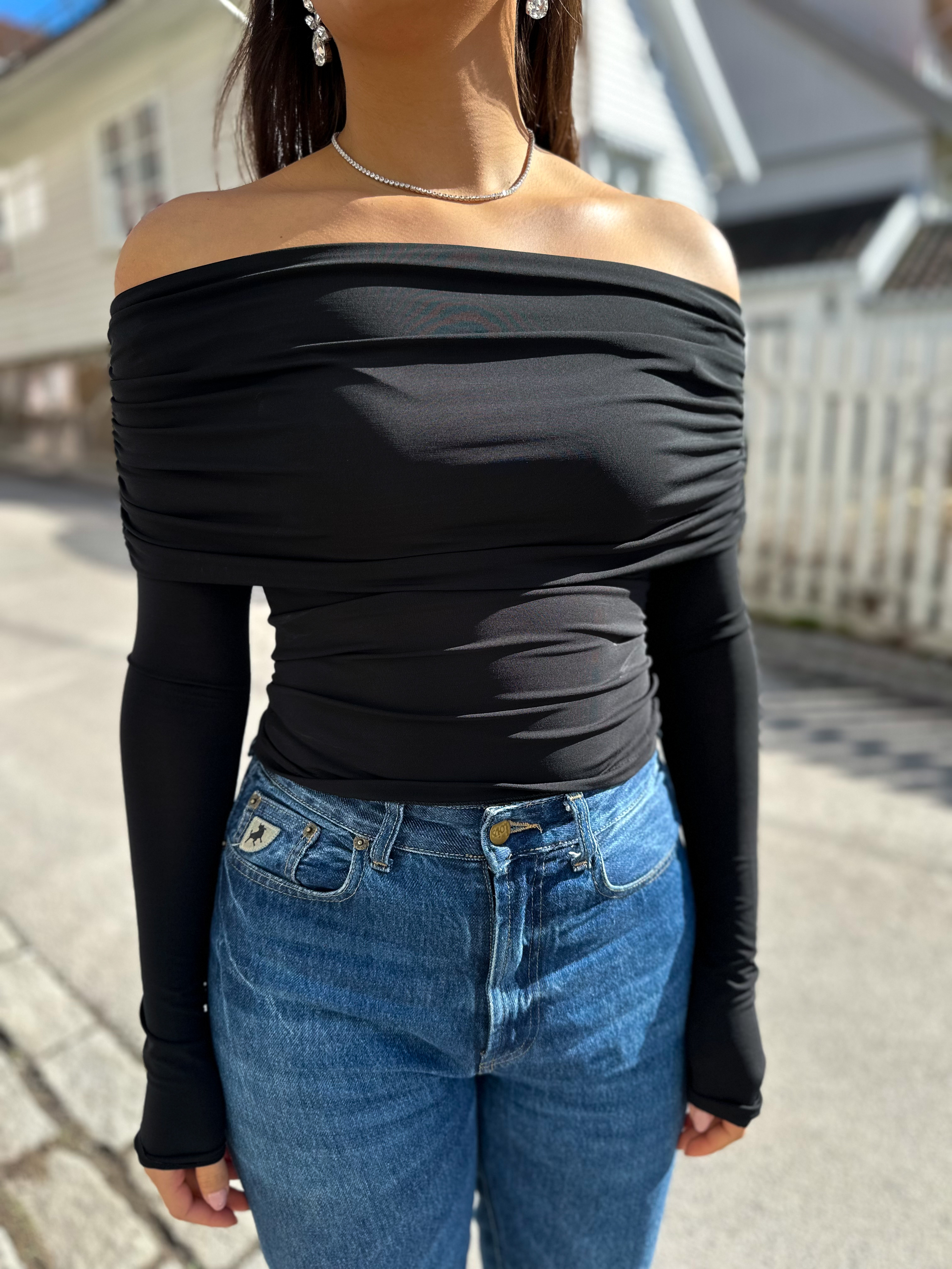 "Off-shoulder Top" fra AVORA. Denne toppen er designet med en brettet rynkete kant, toppen har lange ermer. Stoffet er mykt og elastisk.