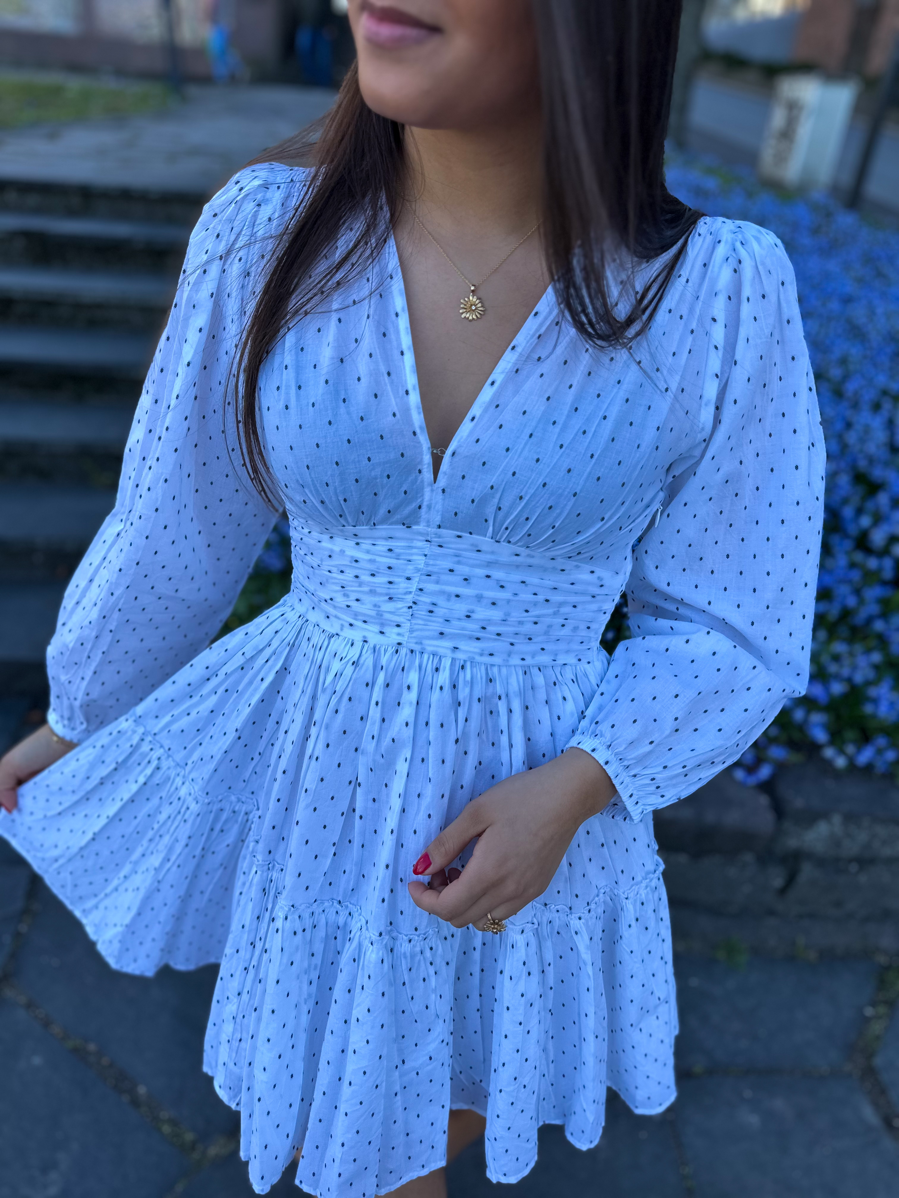 "Noor Dress" fra Missmaya. Denne kjolen har en minilengde, en tilpasset midje med plisserte detaljer og smock i ryggen, og lange, puff ermer med elastiske mansjetter. Kjolen har V-hals og lukkes i siden med glidelås. Kjolen har en behagelig passform og er vanlig i størrelsen.