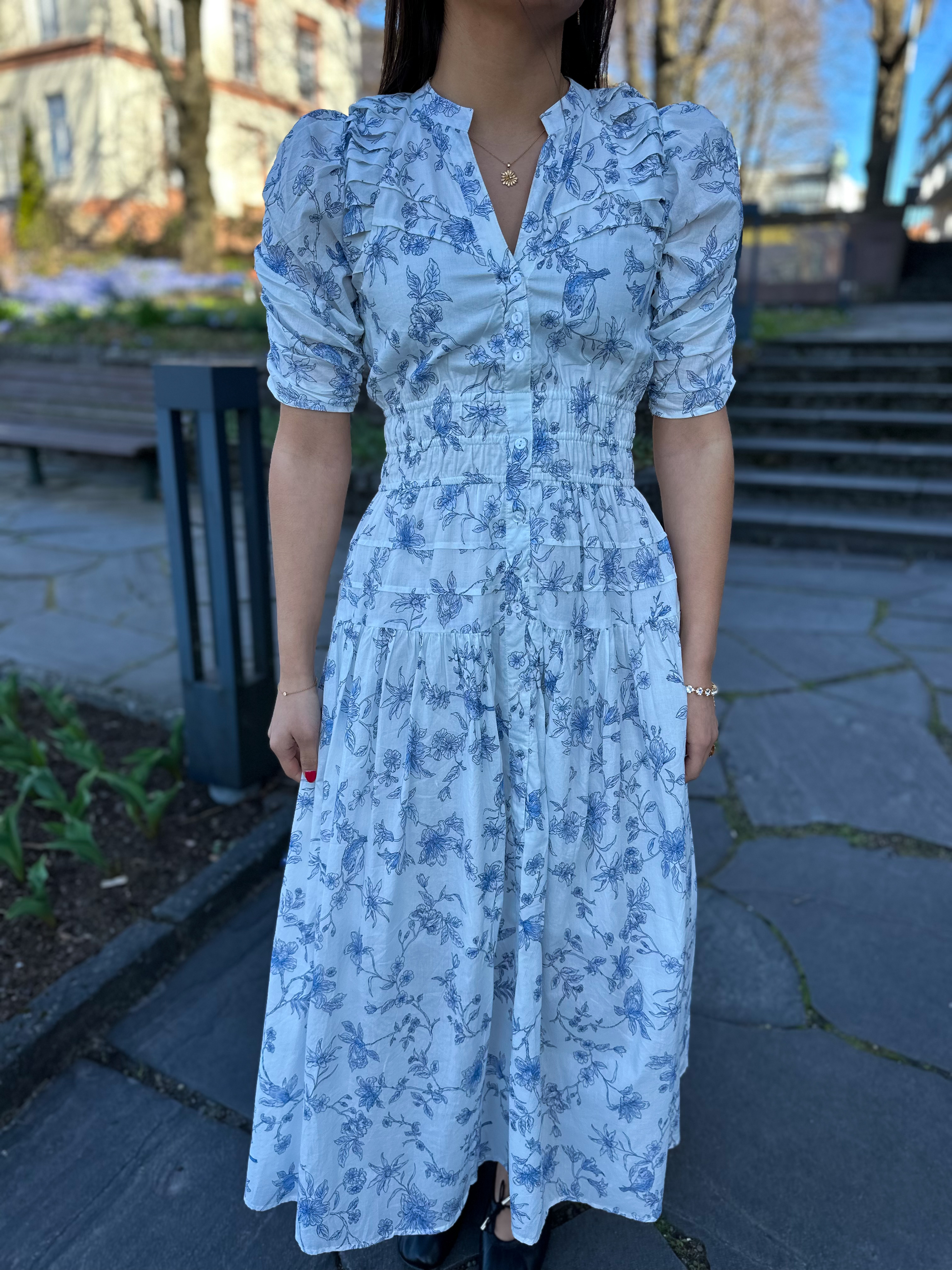 «Fabienne dress» Elegant midi-kjole fra MISSMAYA. Fabienne er laget i luftig bomull, og er designet med kledelig v-ringning, puffermer og komfortabel og flatterende elastisk midje.