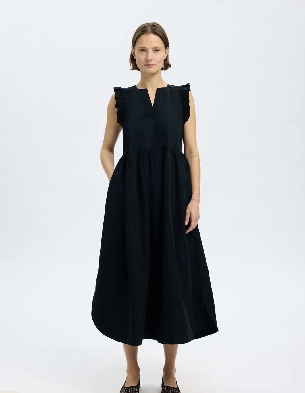 «Blair-Ida top» fra Selected Femme. Søt topp med V-hals og kort erm. Har søte volang detaljer. Kjolen har en midi lengde.