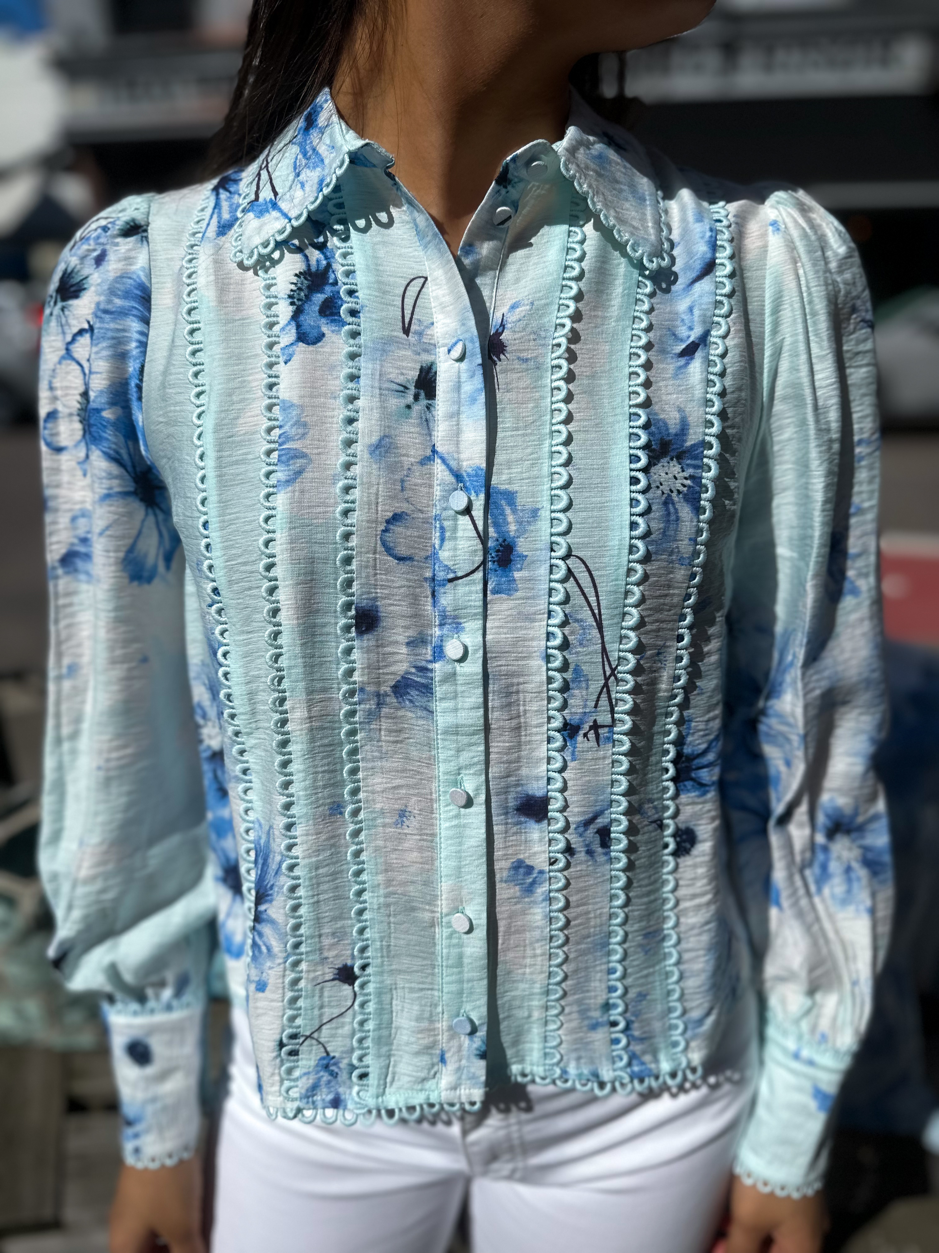 " Billa Shirt - Halogen Blue" er en skjortebluse fra YAS i nydelig print. Den har krage og knepping i front. Vi elsker detaljene med "blonder" langs kantene. Normal i størrelsen.