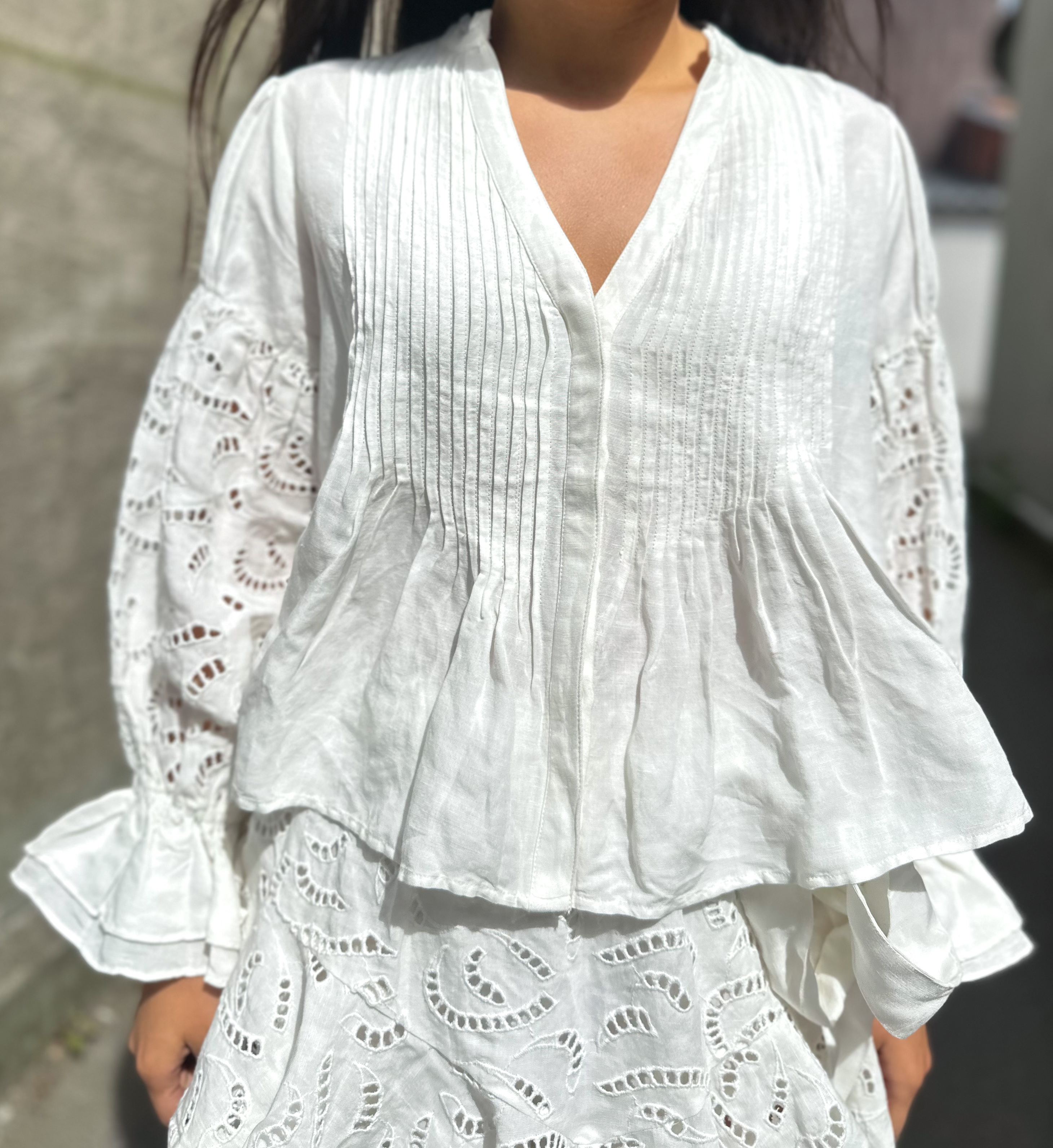 «Coco blouse» fra Confettibird. Vi elsker denne vakre lin-skjorten! Skjorten har rund hals, ballong ermer med vakre volanger. Lukkes med knapper. Perfekt å kombinere med «Coco skirt shorts» for en søt match, eller gå for en avslappet strandlook med bikini.