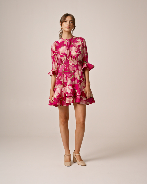 "Viscose Mini Dress" fra byTiMo er kuttet i byTiMo sitte FSC-sertifiserte kvalitet, veldig myk og subtilt gjennomskjær. Kjolen har minilengde, figursydd midje og topp, rund krage og trekvart lange ermer med volangmansjetter. Den har en vakker splittdetalj bak.