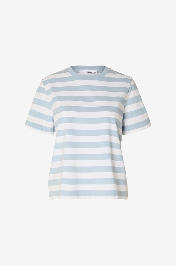 Essential Ss Striped Boxy Tee fra Selected Femme. Det finnes ikke noe bedre enn en enkel, stripete T-skjorte. Denne T-skjorten er skåret til en boxy fit i myk og pustende bomull og er en must-have uansett sesong. Den passer godt til nesten hva som helst, men vi anbefaler å gi den et løft ved å style med denim i mørk vask, joggesko og en strukturert blazer.