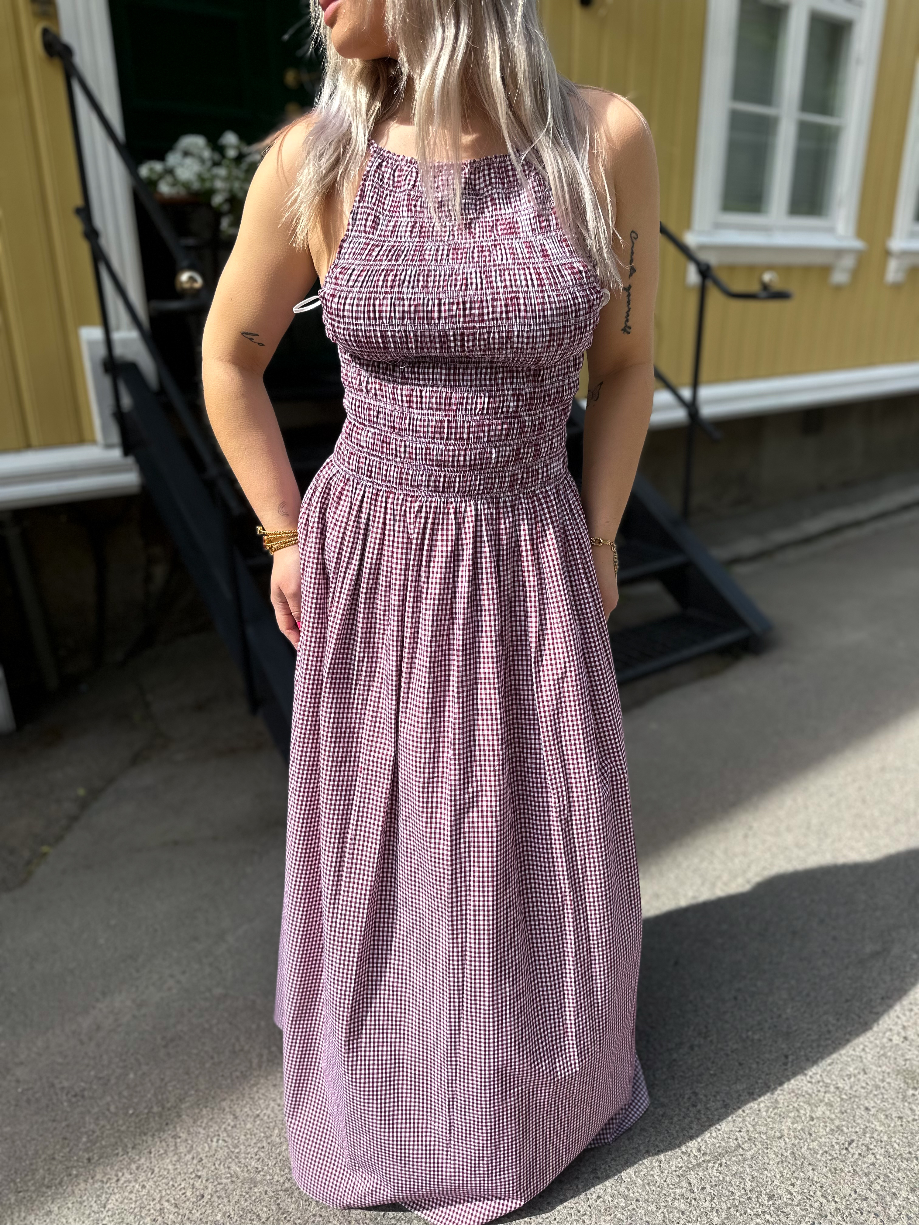 Laia Maxi Dress fra Faithfull the Brand. En feminin midikjole med høy, firkantet halsutringning og tynne, justerbare stropper. Den er smocket i overdelen for ekstra stretch, rynket i midjen og faller deretter ned i et mykt A-formet skjørt som går ned til over anklene. Den er laget av økologisk bomull i en myk rosafarge og tilbyr et avslappende antrekk til lange lunsjer og ferieantrekk.