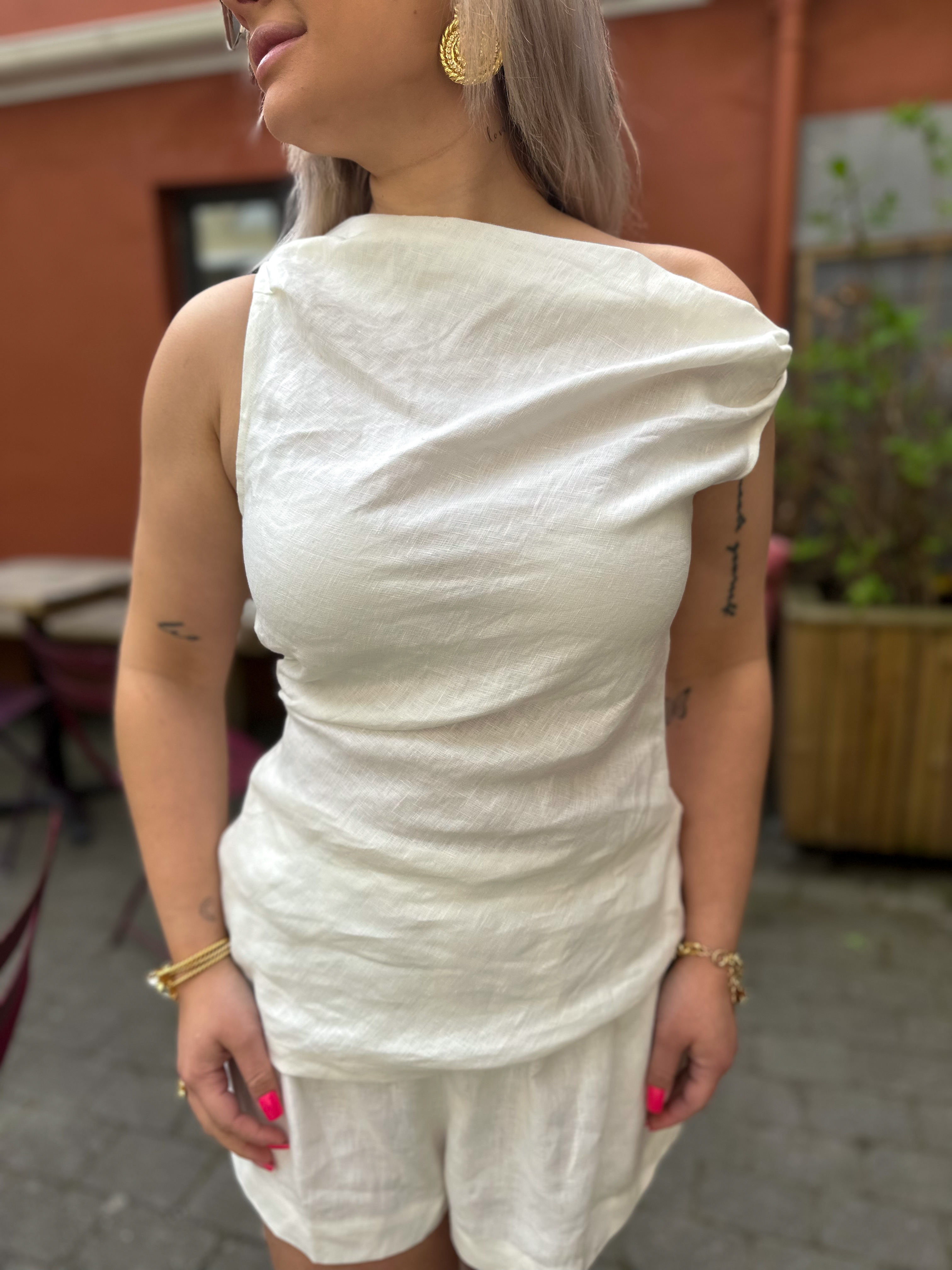 "Suis Top" fra Faithfull The Brand. En tidløs topp i lin. Den har asymmetrisk én-skulder utringning med draperte detaljer foran. Fasongen er lett innsvingt i midjen og faller løst over hoftene. Perfekt sammen med Suis-skjørtet for en elegant sommerlook.