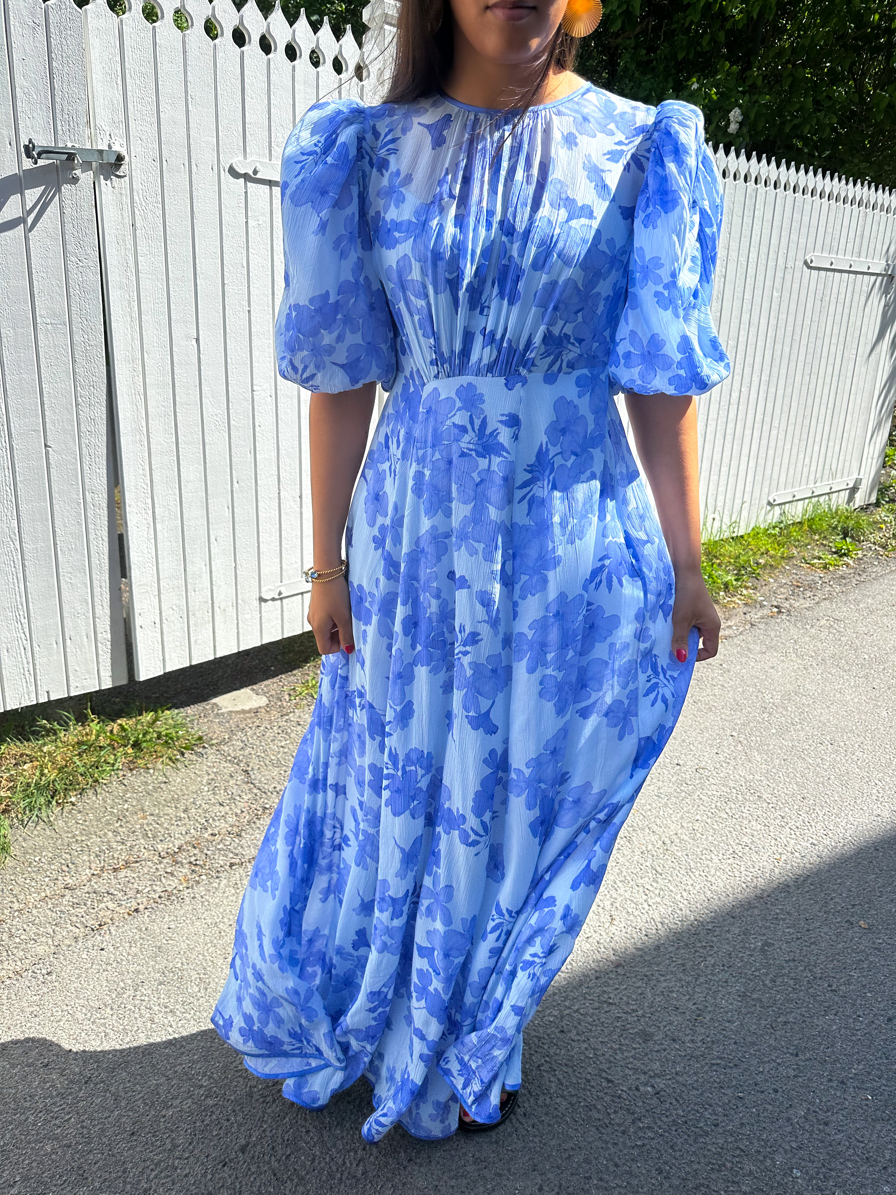 "Chiffon Maxi Dress" fra byTiMo er laget i byTiMo sin lette, FSC-sertifiserte viskosemateriale. Den har en maxilengde, høy midje og albuelange puffermede ermer med rynking og elastiske mansjetter. Overdelen har en splittdetalj i ryggen og en rund krage. Kjolen lukkes i siden med glidelås.