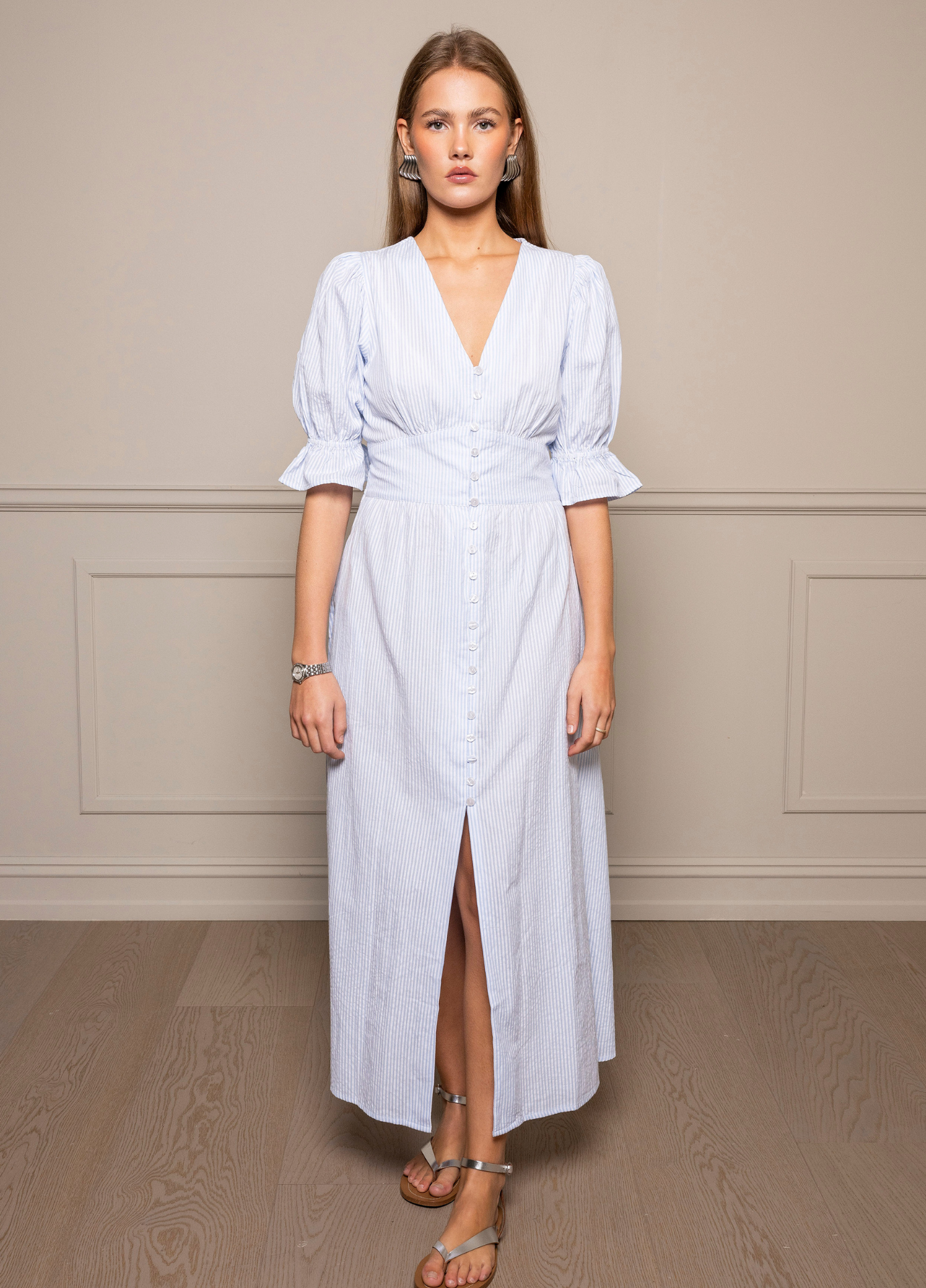"Andrea Dress" fra MISSMAYA. Denne kjolen er laget i 100 % bomull av høy kvalitet – lett og behagelig mot huden. Den har en flatterende midilengde, innsvinget midje og store, voluminøse ermer som gir et elegant uttrykk. Knapper i front gir et klassisk preg, og skjørtet har innerfôr for ekstra komfort. Passformen er normal – velg din vanlige størrelse.