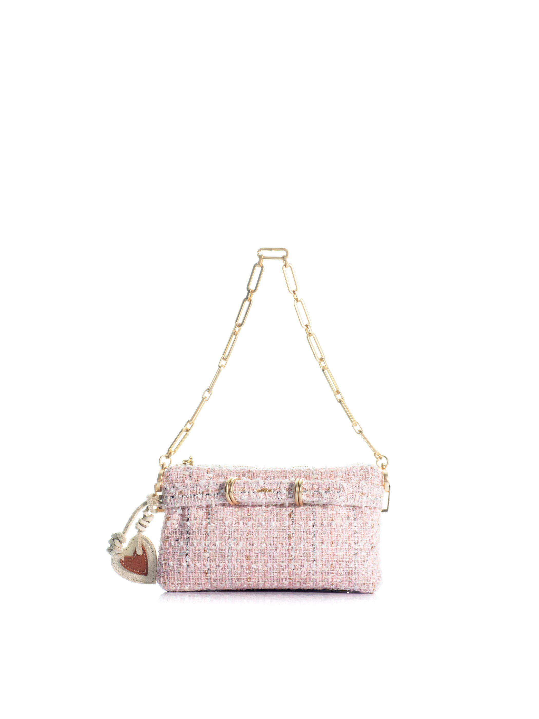 "The Porte Monnaie" fra Kooreloo er et håndlaget designtilbehør som uttrykker din sans for luksus og detaljfokusert håndverk. Denne elegante minivesken er laget i luksuriøs rosa tweed med strukturert finish og pyntet med et dekorativt belte for en sofistikert touch. Gullfarget kjedestropp, preget myntanheng og et hjerte i skinn gir vesken et unikt og karaktersterkt uttrykk.