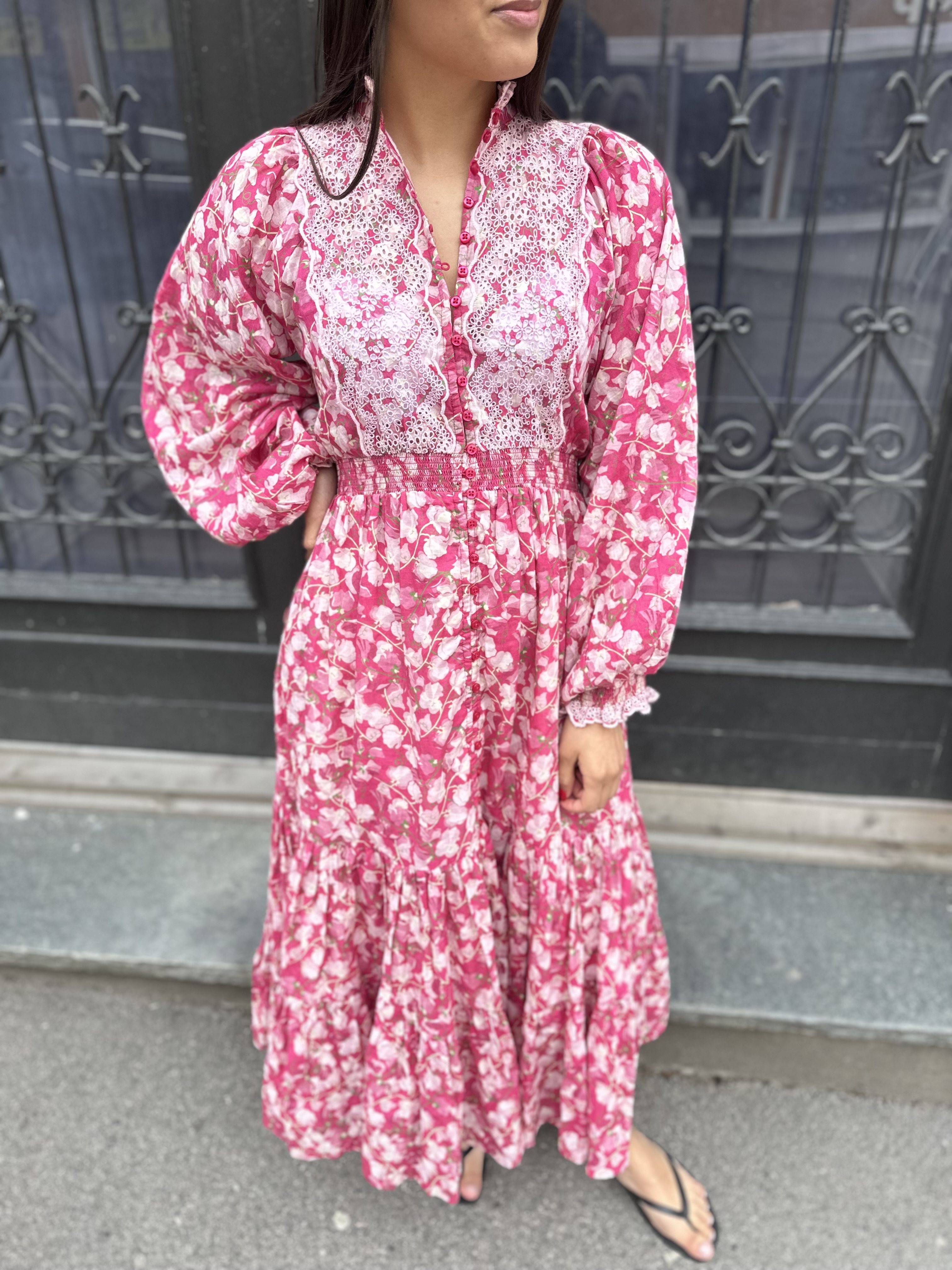 "Cotton Slub Midi Dress" fra byTiMo. En nydelig midikjole fra byTiMo. Cotton Slub Midi Dress er kuttet i byTiMos lette og myke bomull- og viskoseblanding med slubdetaljer i stoffet. Den har en minilengde og definert, smocket midje. Kjolen har oversizede, vintage-inspirerte, korte ermer og er satt inn med broderie anglaise detaljer på brystet, ermene, mansjettene og halsen. Cotton Slub Midi Dress har et elegant midiskjørt med volum, knappelukking i front og knytebelte i livet.