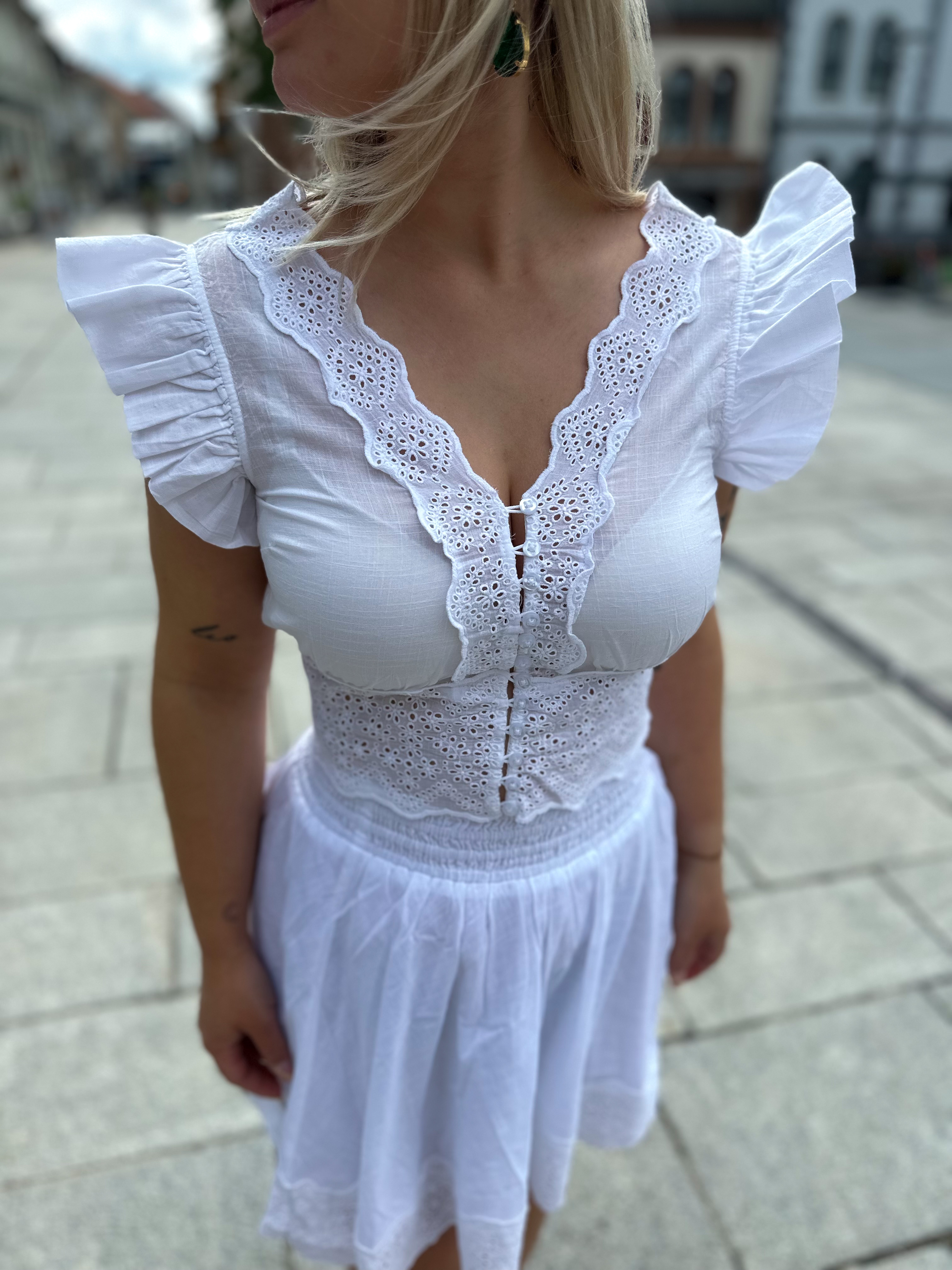 "Cotton Slub Top" fra byTiMo er laget i byTiMo sitt lette og myke GOTS-sertifiserte bomullsstoff, med slub-detaljer i tekstilen. Toppen har en tettsittende silhuett og er ermeløs med volangdetaljer som dekker skuldrene. Den har en V-utringning og knepping foran.