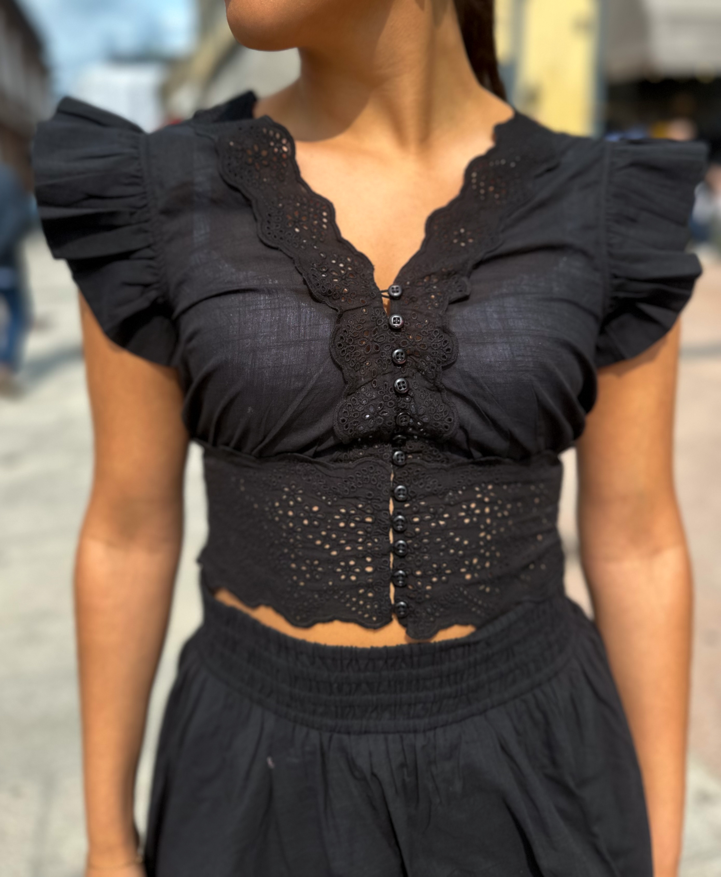 "Cotton Slub Top" fra byTiMo er laget i byTiMo sitt lette og myke GOTS-sertifiserte bomullsstoff, med slub-detaljer i tekstilen. Toppen har en tettsittende silhuett og er ermeløs med volangdetaljer som dekker skuldrene. Den har en V-utringning og knepping foran.