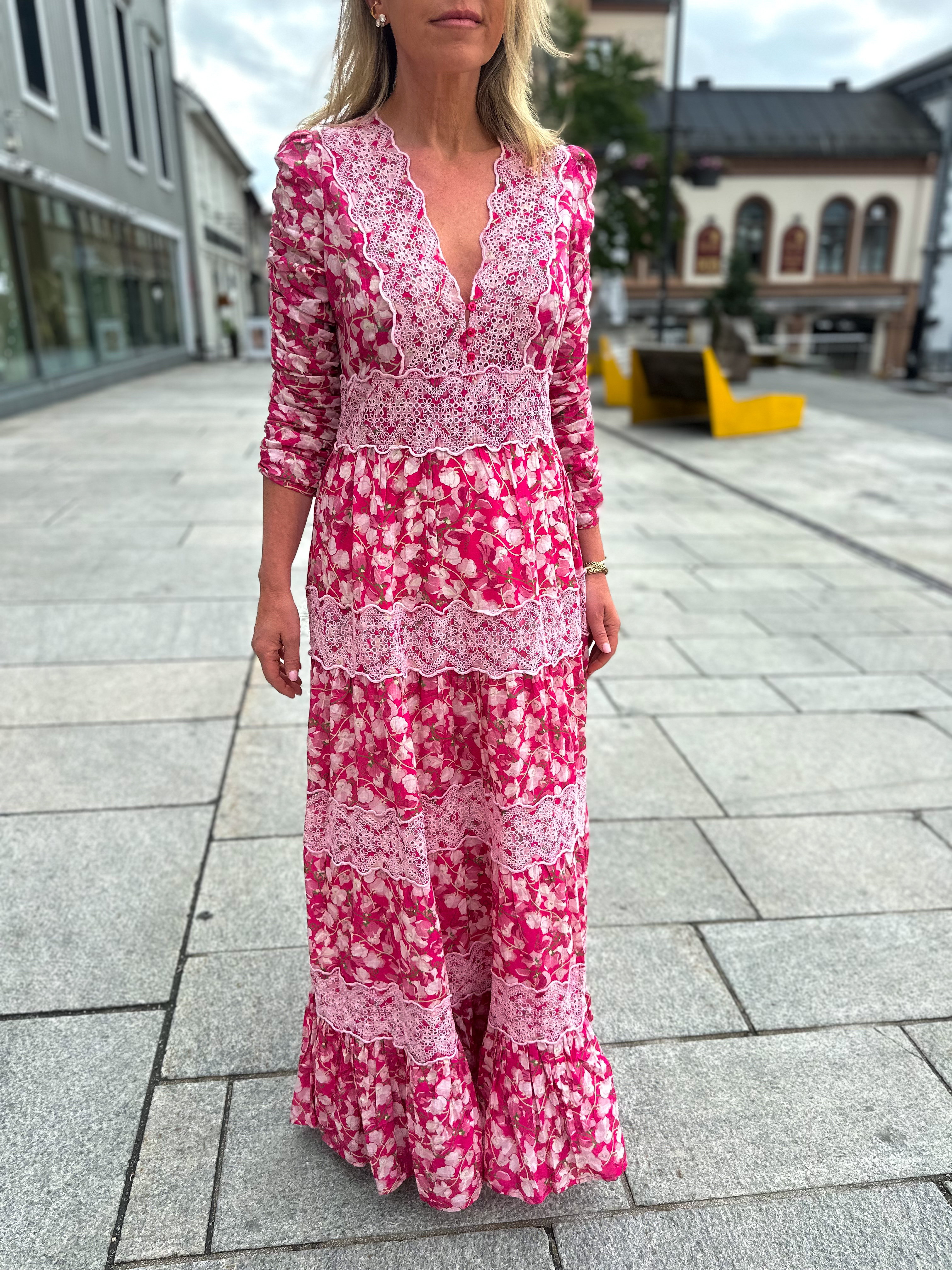 "Cotton Slub Maxi Dress" fra byTimo. Super fin maxi kjole med flere kapper på skjørtet, kjolen har v-hals og vakker brodering på!