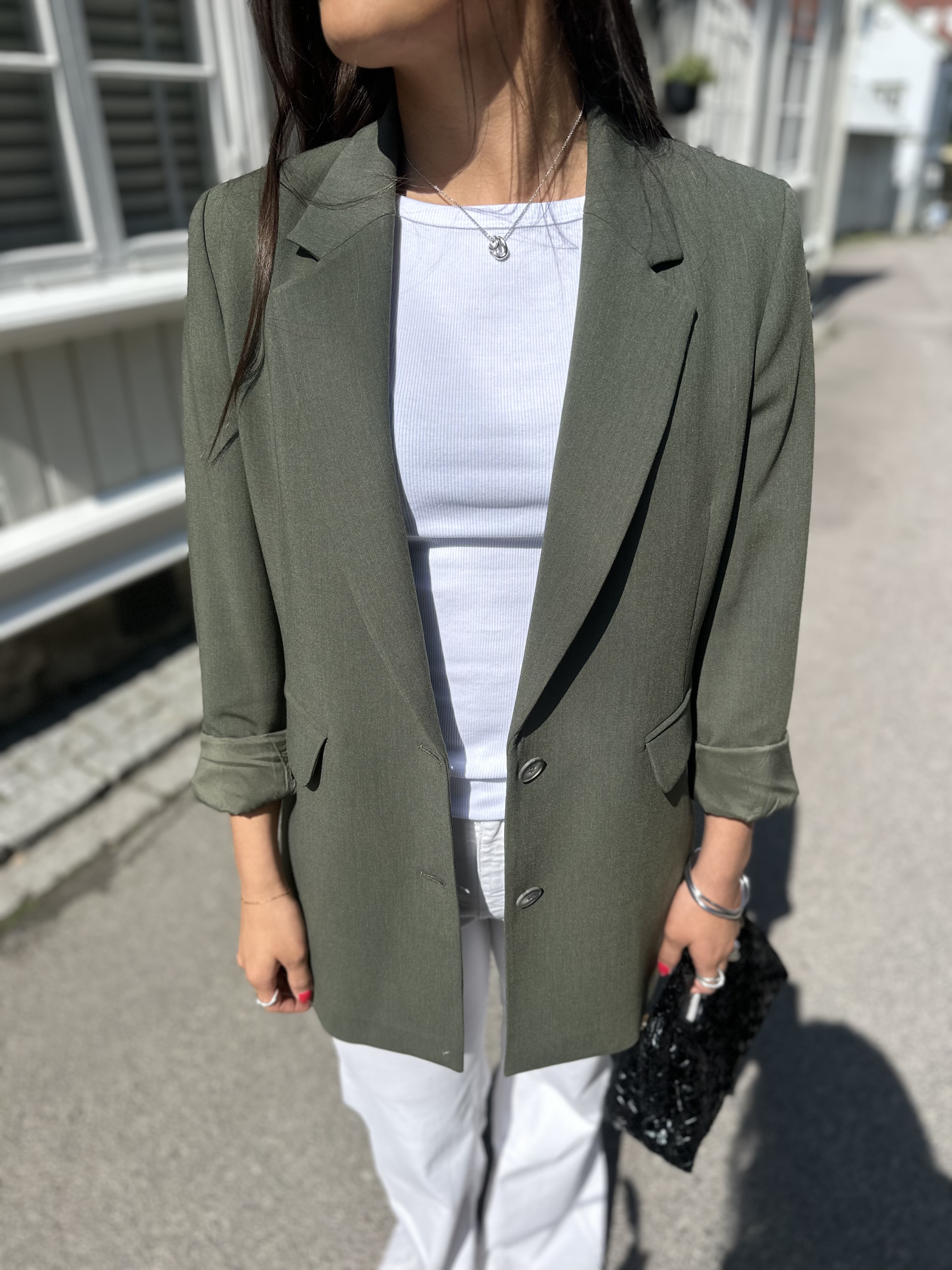 «Rita relaxed blazer» fra Selected Femme er en oversized blazer. Den har en avslappet passform, tynne skulderputer, lommer i front og lange ermer. Lukkes med knapper.