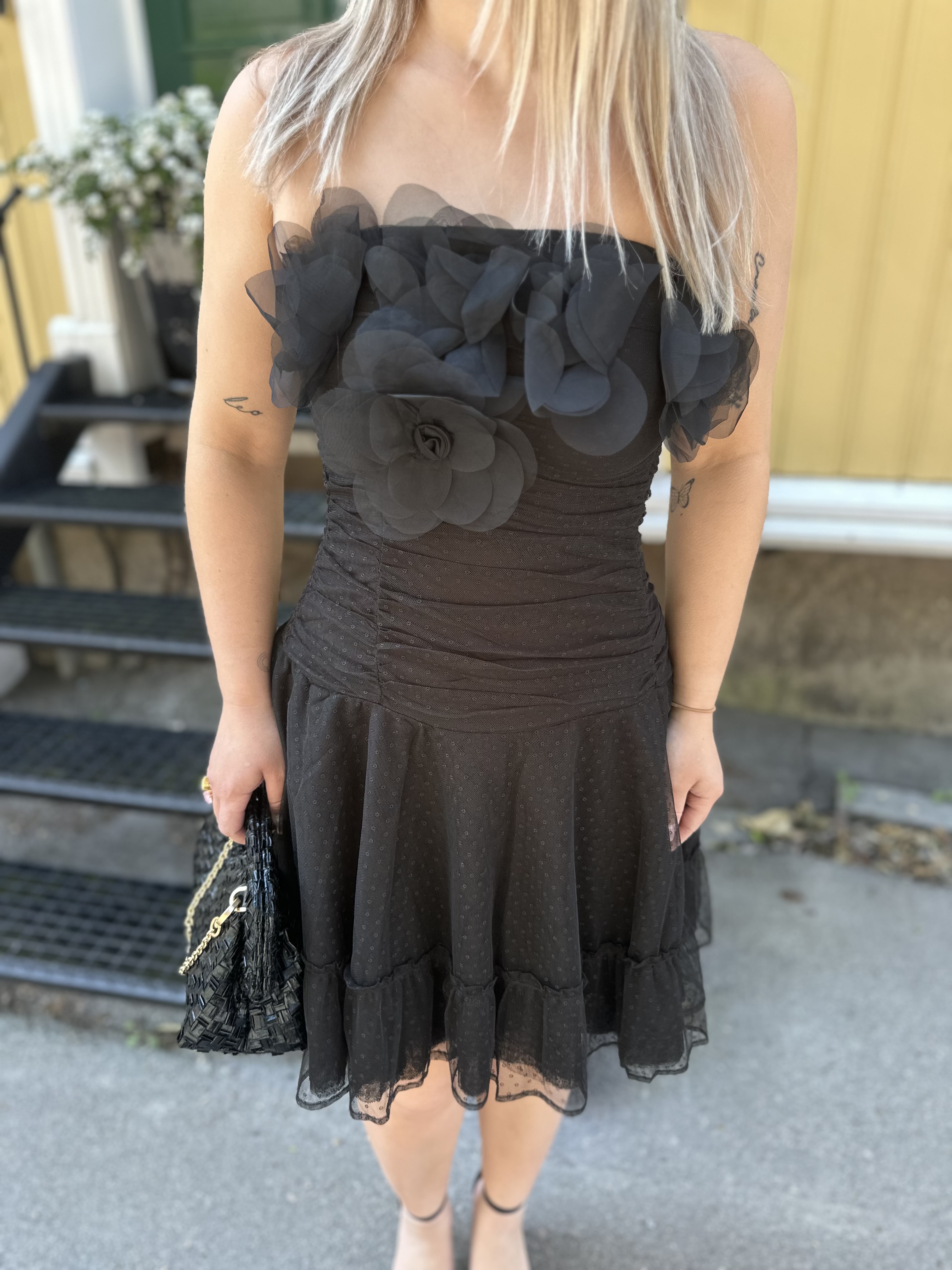 "Tulle Mini Dress" fra byTiMo. Tulle Mini-kjolen er laget i byTiMo sitt delikate, GRS-sertifiserte polyesterstoff. Kjolen har en kort lengde, tettsittende overkropp og utsvingt skjørt. Overkroppen er dekorert med rynkedetaljer foran og på sidene, samt elastisk smock i ryggen. Vakre blomsterdetaljer pryder brystpartiet.