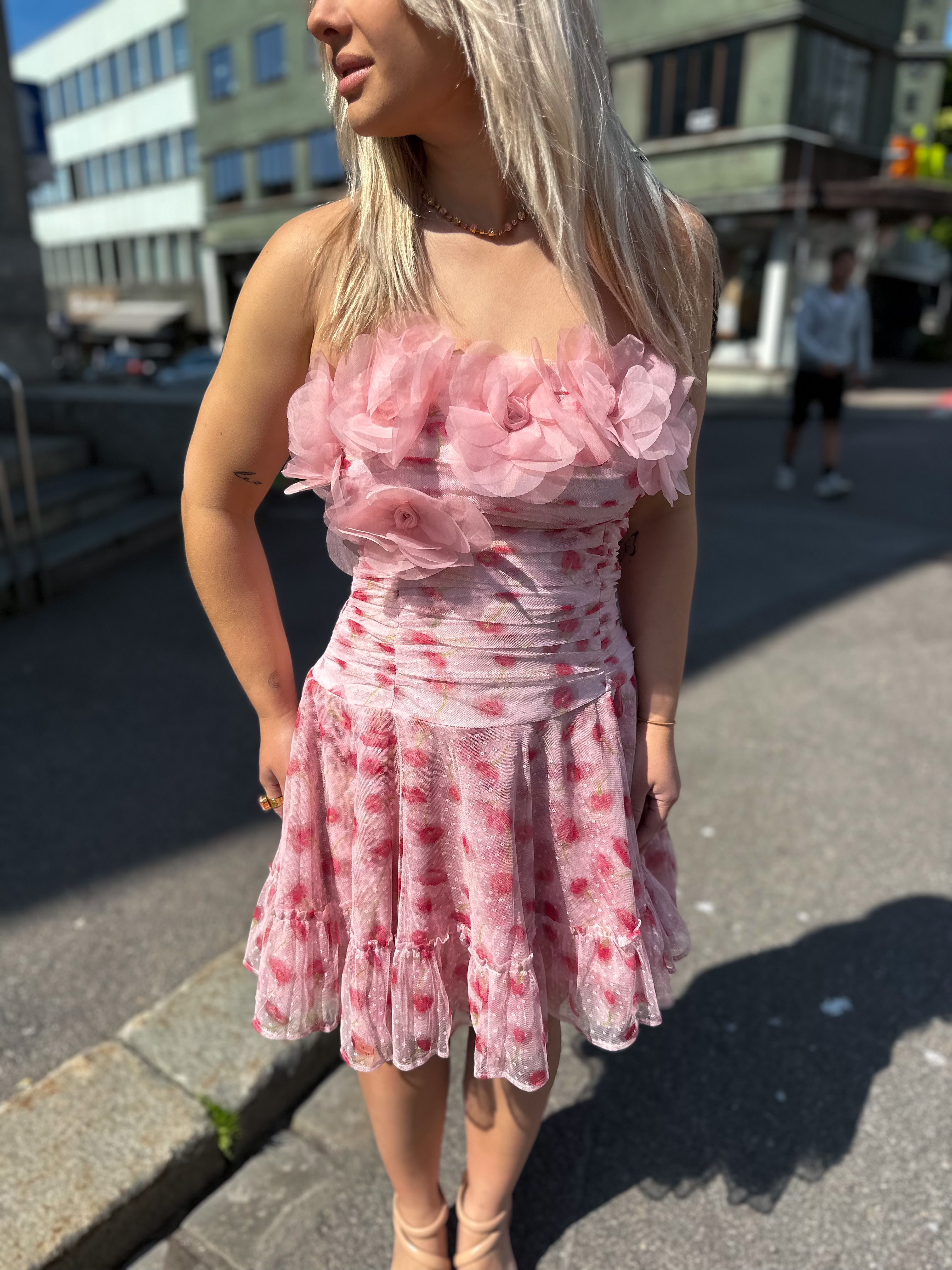 "Tulle Mini Dress" fra byTiMo. Tulle Mini-kjolen er laget i byTiMo sitt delikate, GRS-sertifiserte polyesterstoff. Kjolen har en kort lengde, tettsittende overkropp og utsvingt skjørt. Overkroppen er dekorert med rynkedetaljer foran og på sidene, samt elastisk smock i ryggen. Vakre blomsterdetaljer pryder brystpartiet.