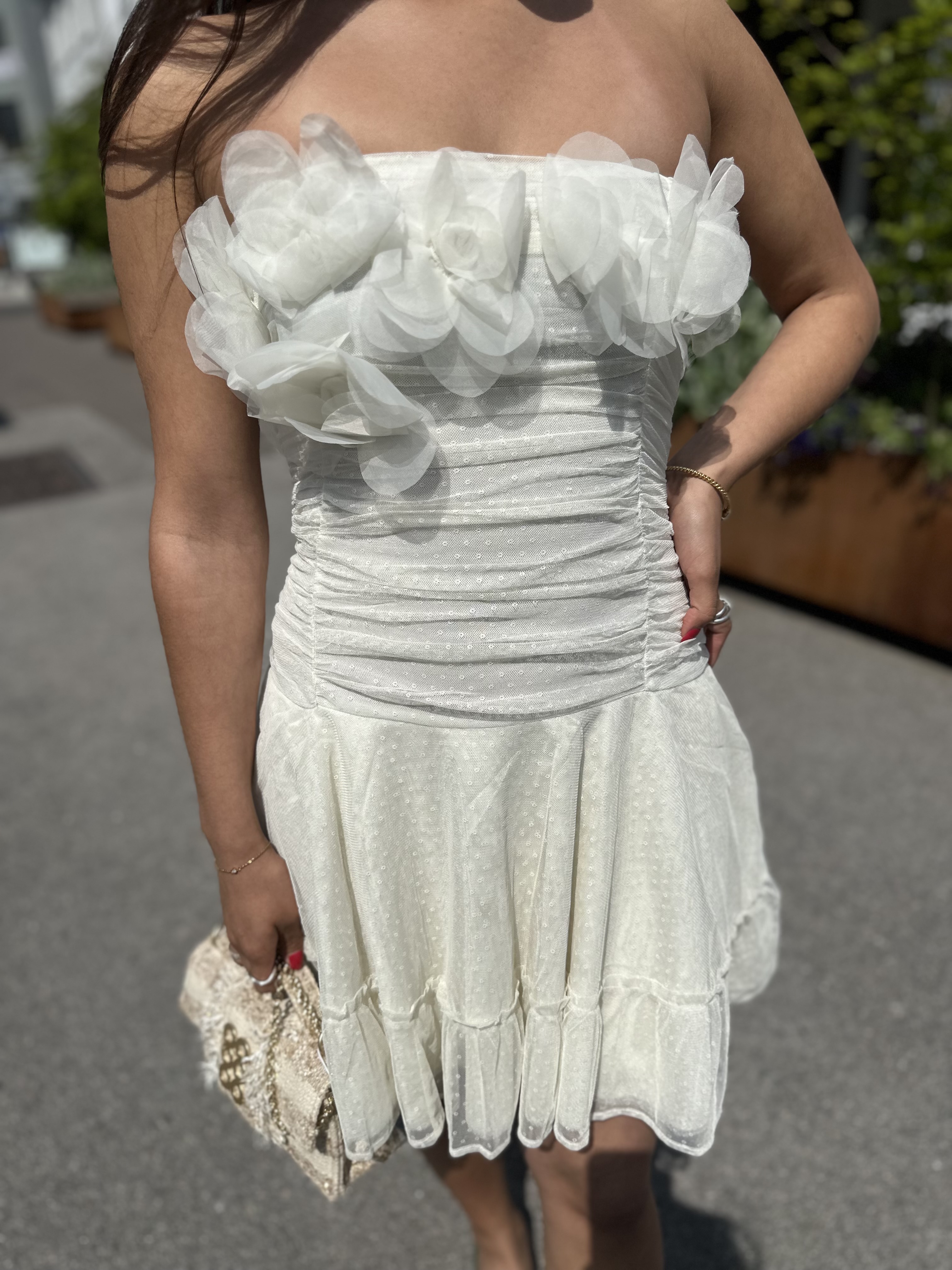 "Tulle Mini Dress" fra byTiMo. Tulle Mini-kjolen er laget i byTiMo sitt delikate, GRS-sertifiserte polyesterstoff. Kjolen har en kort lengde, tettsittende overkropp og utsvingt skjørt. Overkroppen er dekorert med rynkedetaljer foran og på sidene, samt elastisk smock i ryggen. Vakre blomsterdetaljer pryder brystpartiet.