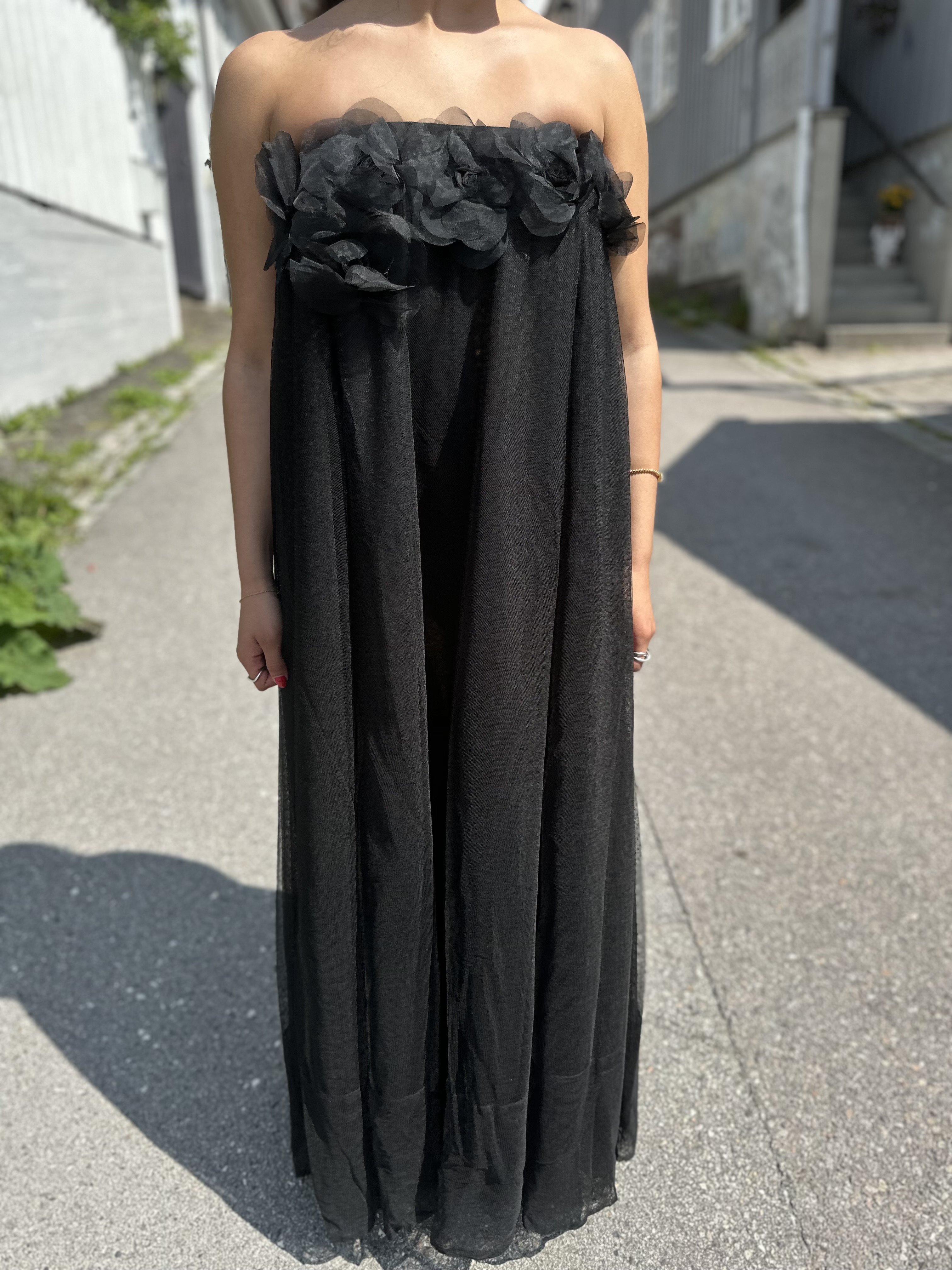 "Tulle Decorated Dress" fra byTiMo. Tulle Decorated-kjolen er laget i byTiMo sitt delikate, GRS-sertifiserte polyesterstoff. Kjolen har en maxi lengde og en voluminøs, flytende silhuett. Den har en elastisk kant øverst rundt hele overkanten for å holde den på plass, samt vakre blomsterdetaljer over brystet.