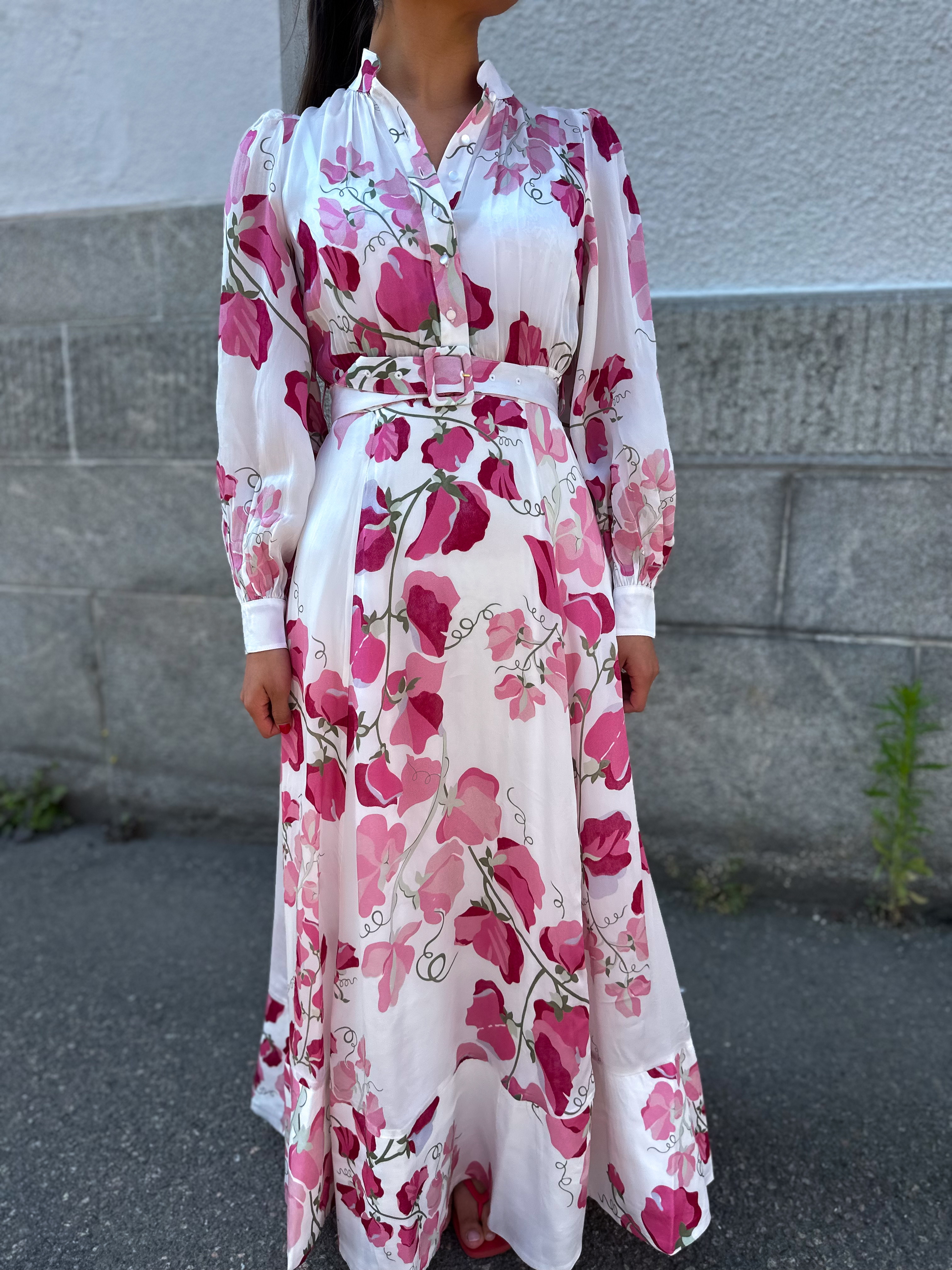 "Organza Maxi Dress" fra byTiMo. Organza Maxi Dress er laget i litt gjennomsiktige, FSC-sertifiserte viskosekvalitet. Denne maxikjolen har en innsvinget midje, mandarinkrage med knapper på toppen og lange puffermer med stramme mansjetter. Kjolen har beltehemper i midjen og leveres med et løst, matchende belte.