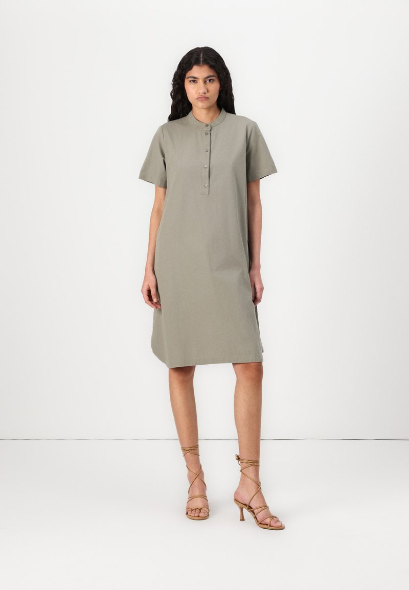 «Blair Short Dress» fra Selected Femme. Denne skjortekjolen er et tidløst og komfortabelt valg som kan brukes uansett sesong. Den er laget av økologisk bomull, noe som gjør den myk og pustende – perfekt til de varmere månedene – og den har en relaxed, loose fit. Style med vevde espadriller og en toteveske til ærender i byen.